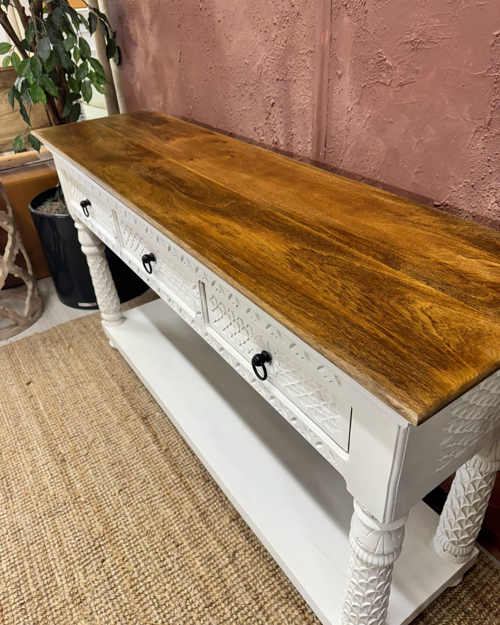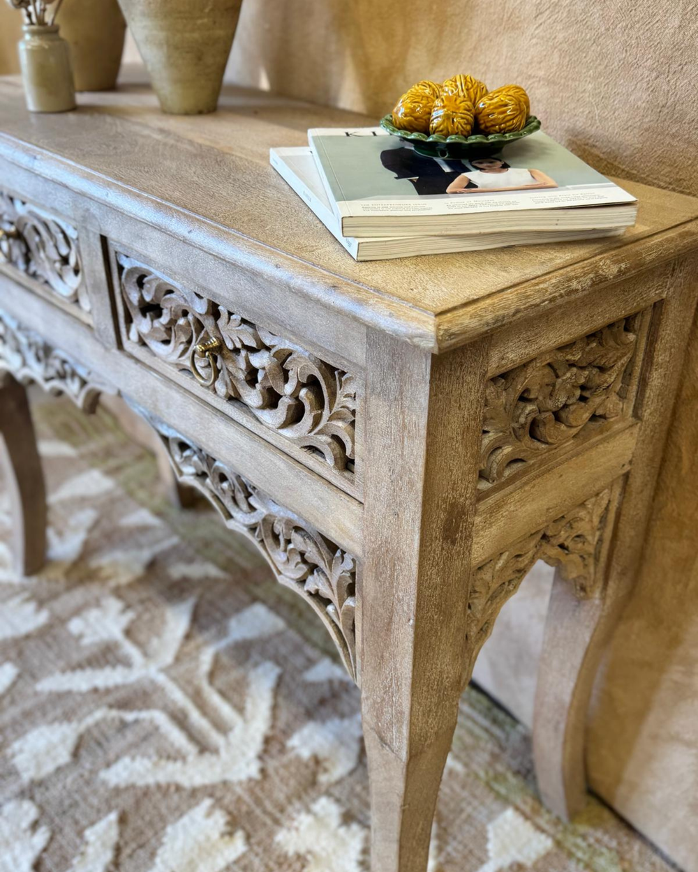 Consola de madera de mango tallada a mano, con acabado blanqueado y dos cajones.