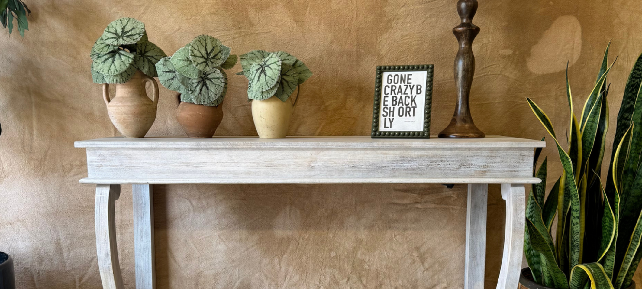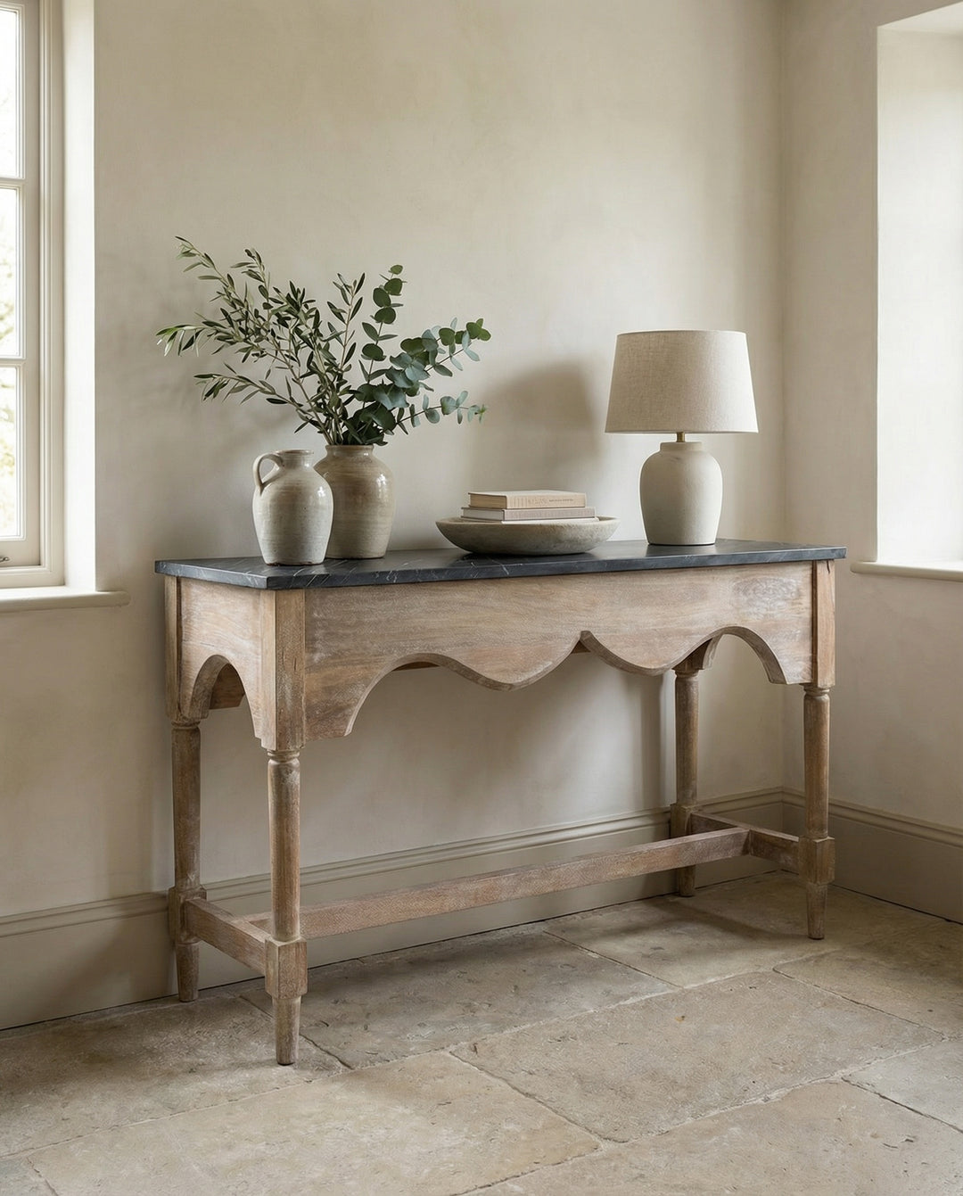 Consola larga de madera de mango tallada a mano con estante, acabado en crema