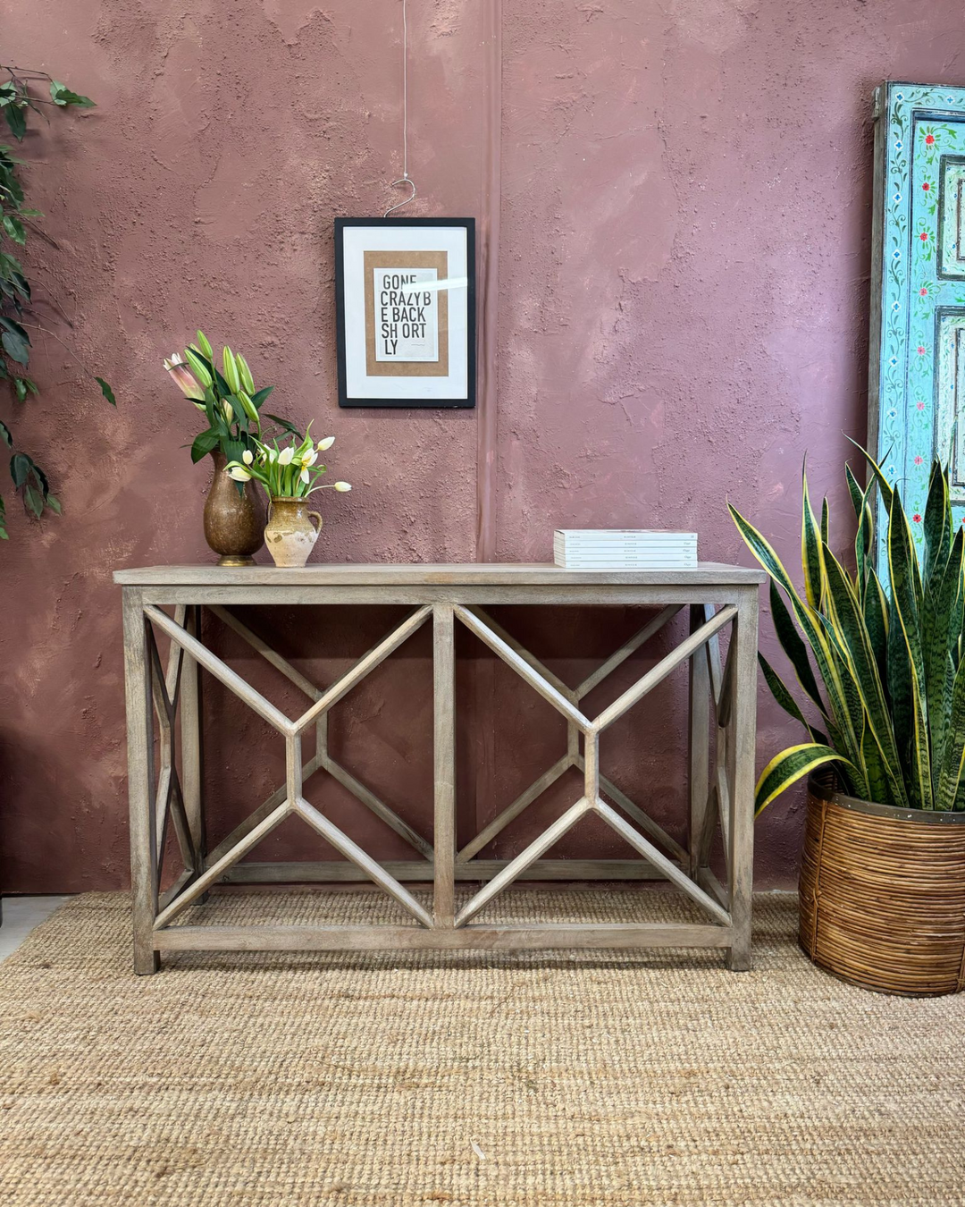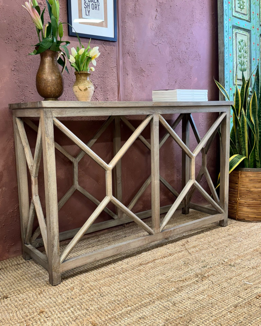 Consola contemporánea de madera de mango con estructura geométrica y acabado natural.