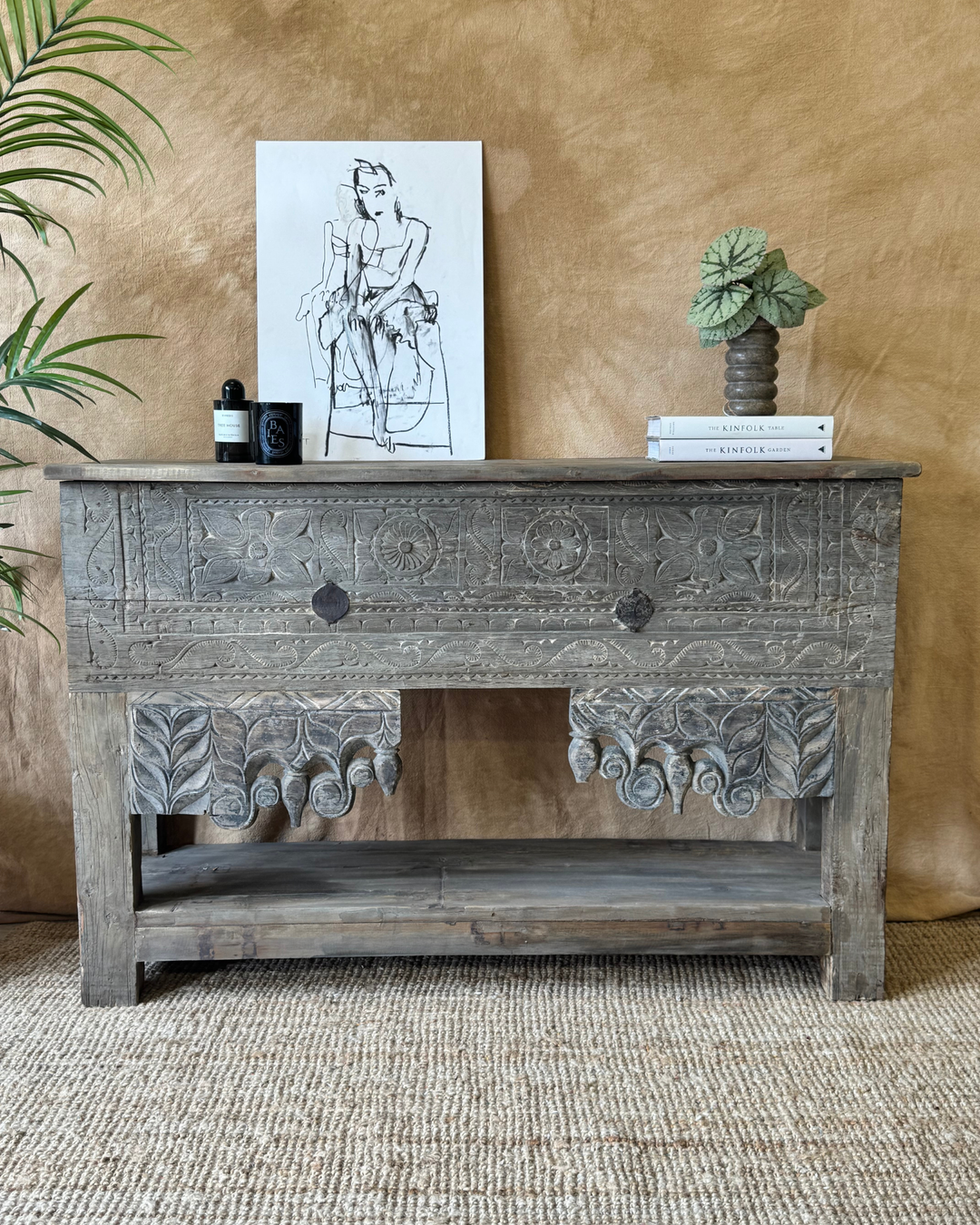 Consola vintage de teca tallada a mano con acabado blanqueado por el sol