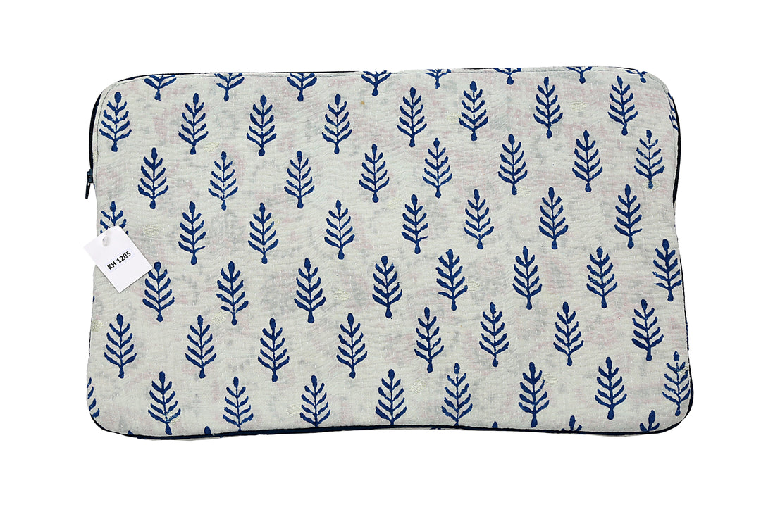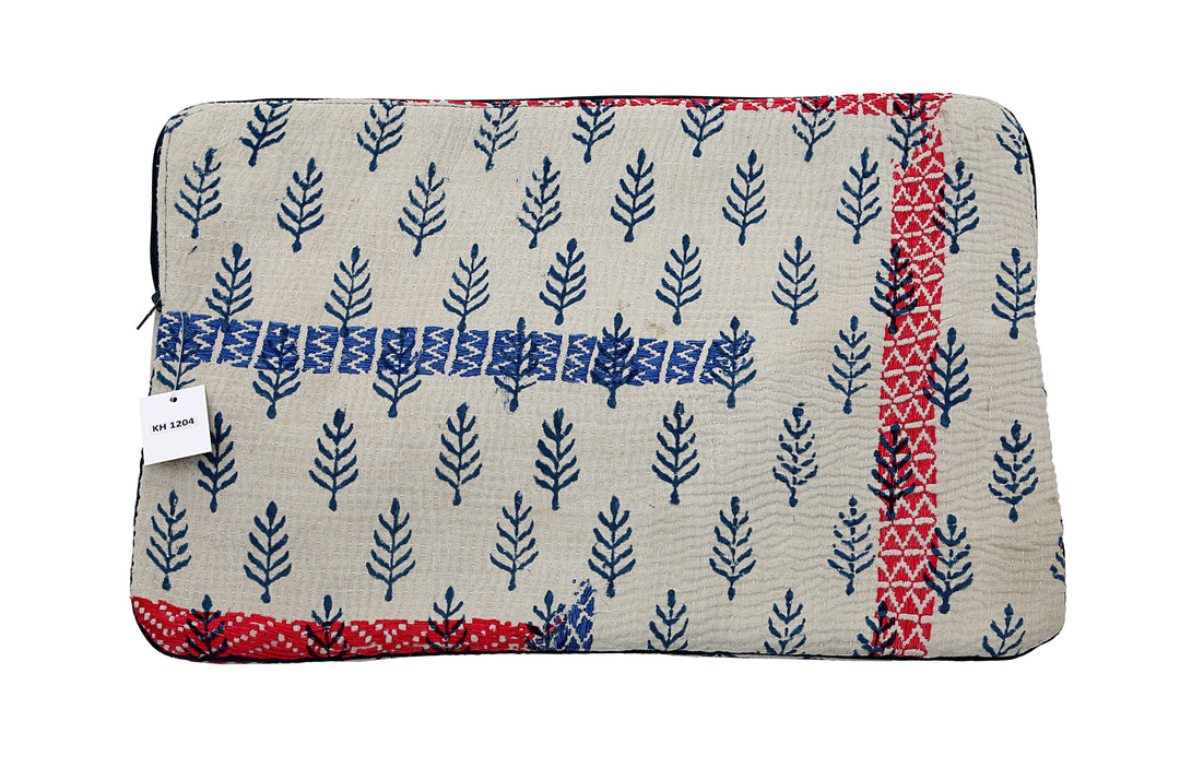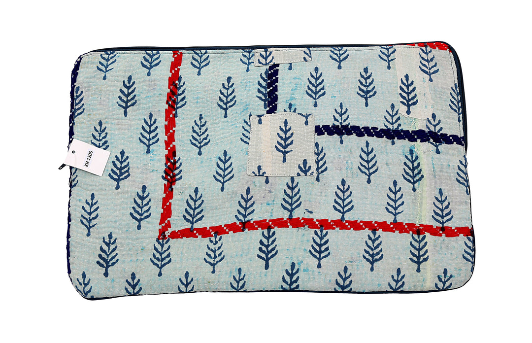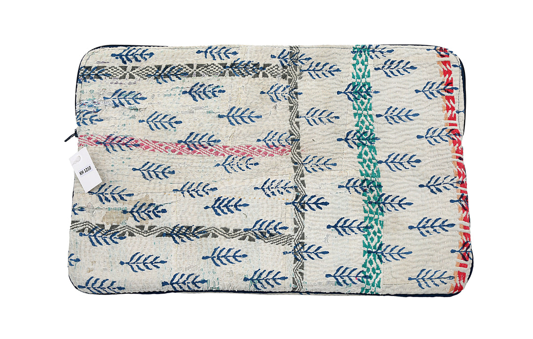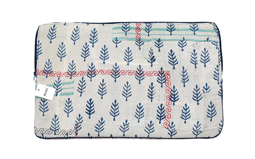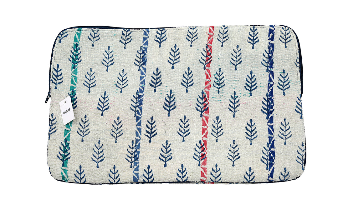 Funda para portátil de sari reutilizada: diseño kantha a rayas sobre estampado de árboles