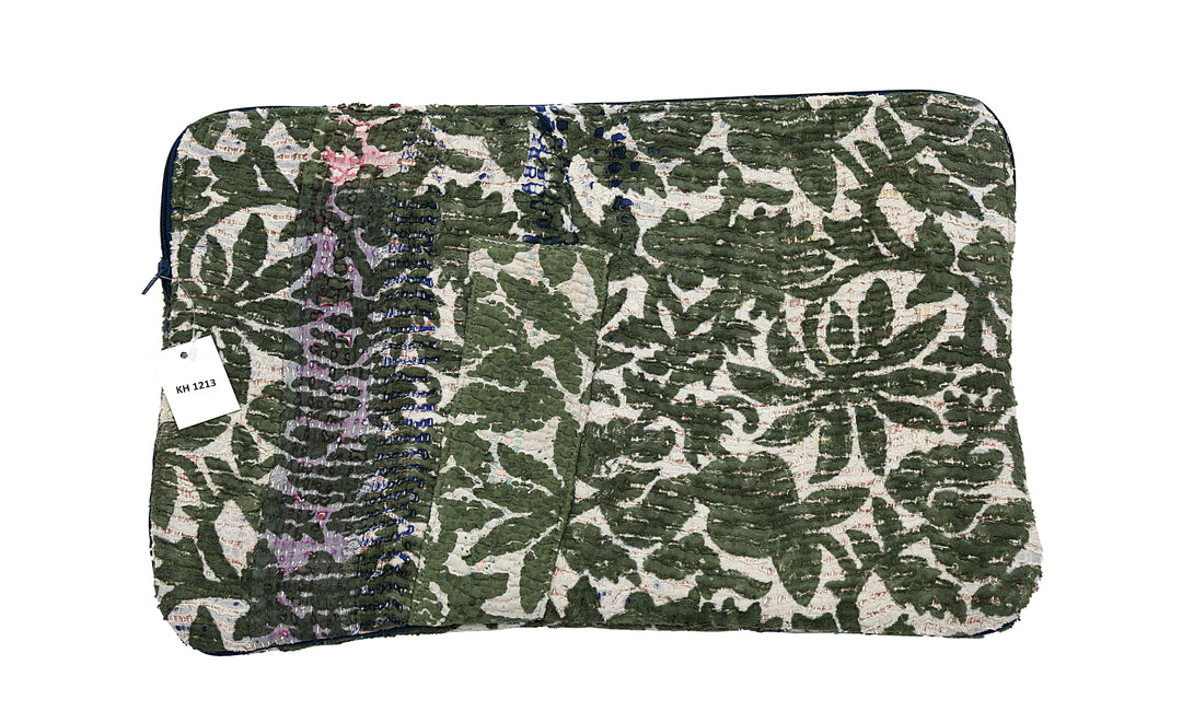 Funda para portátil de sari reutilizada: estampado floral verde intenso con puntadas índigo