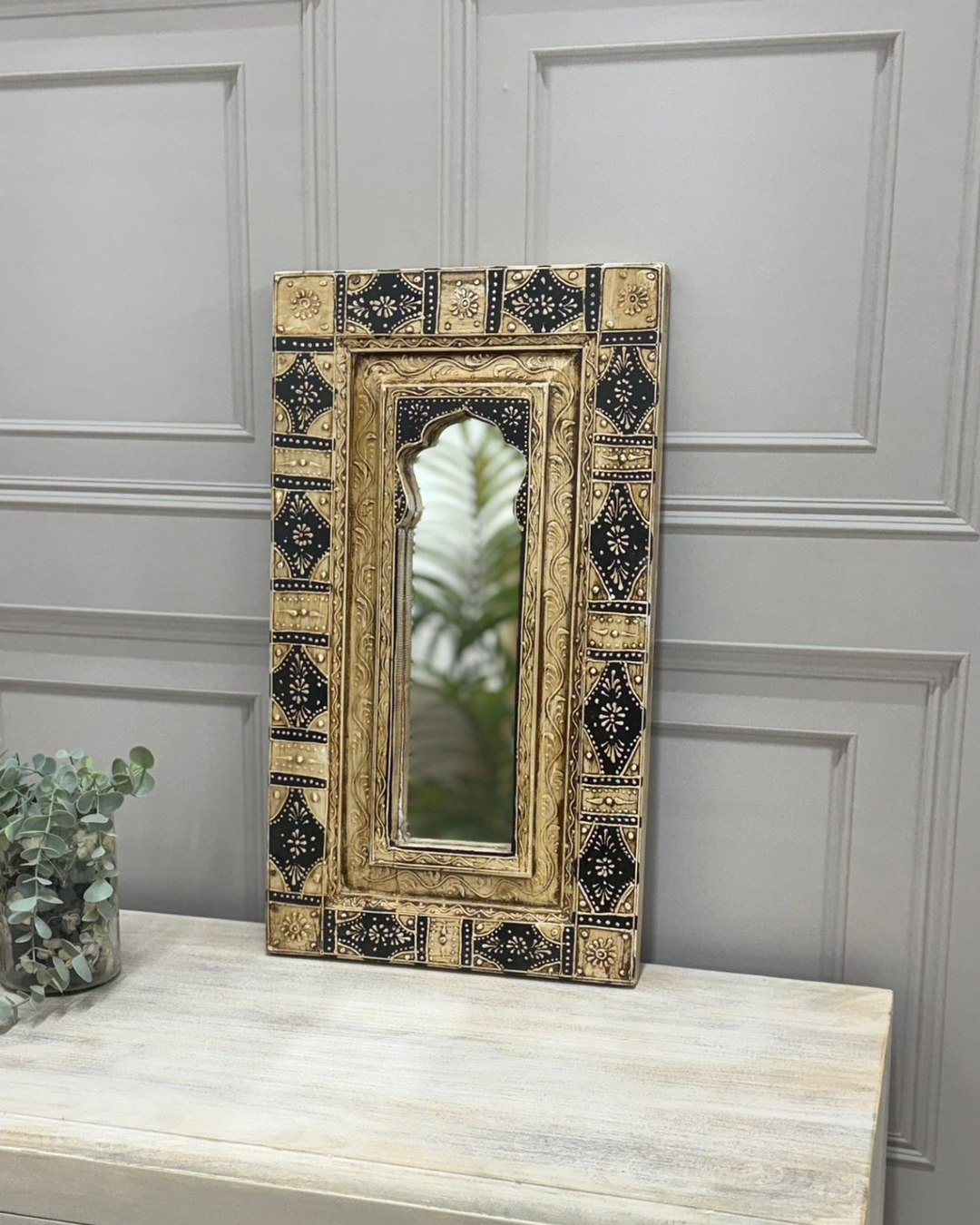 Hand-Painted Reclaimed Mango Wood Vintage Mirror – Black & Natural Carved Frame