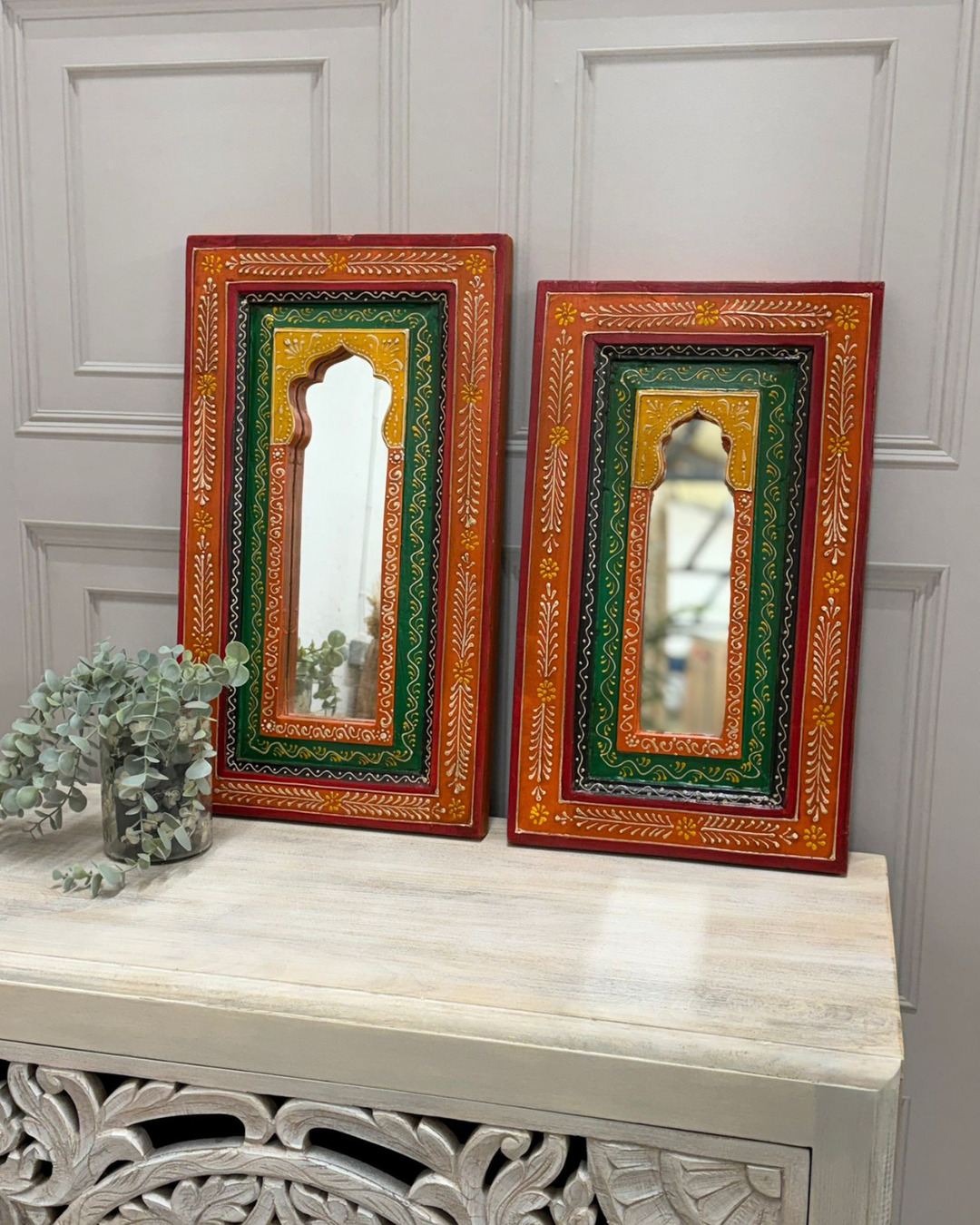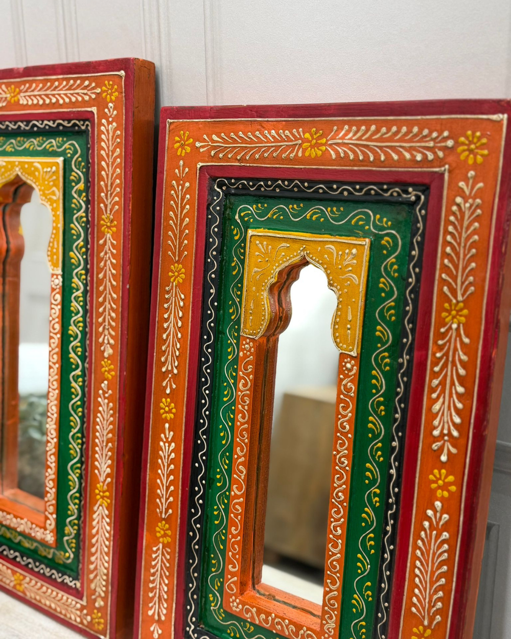 Hand-Painted Mango Wood Arch Mirrors – Vintage Indian Art Frame (Set of 2)