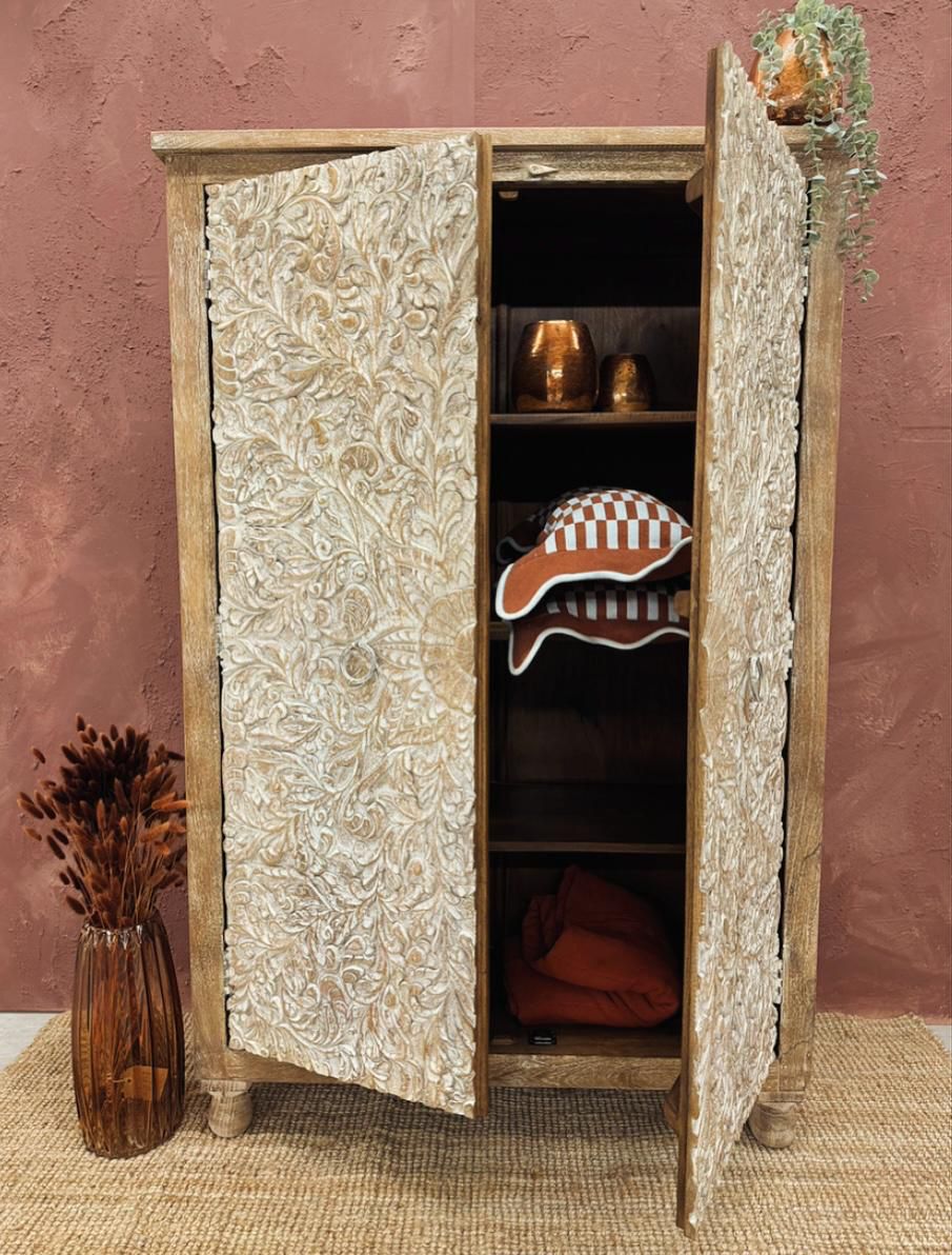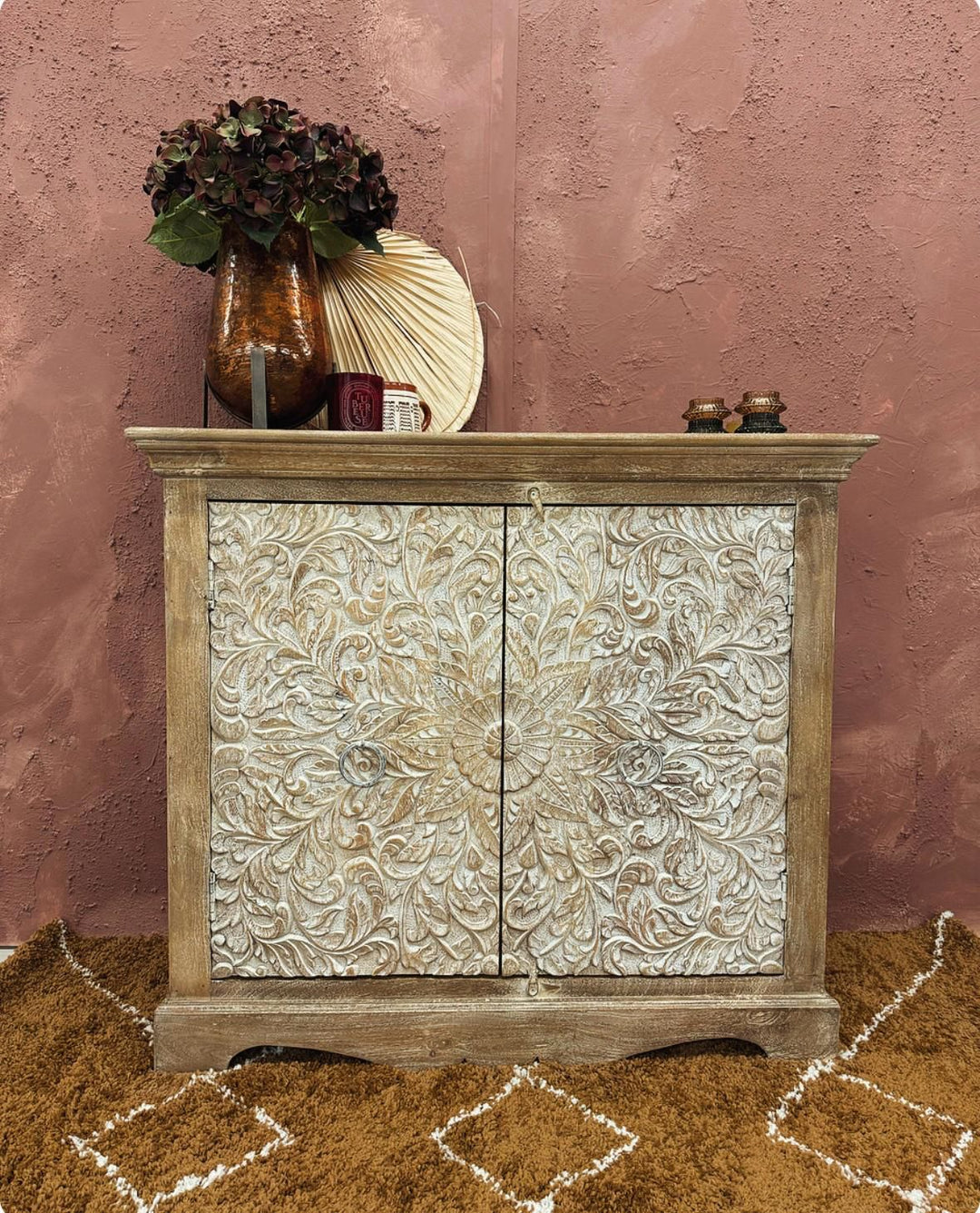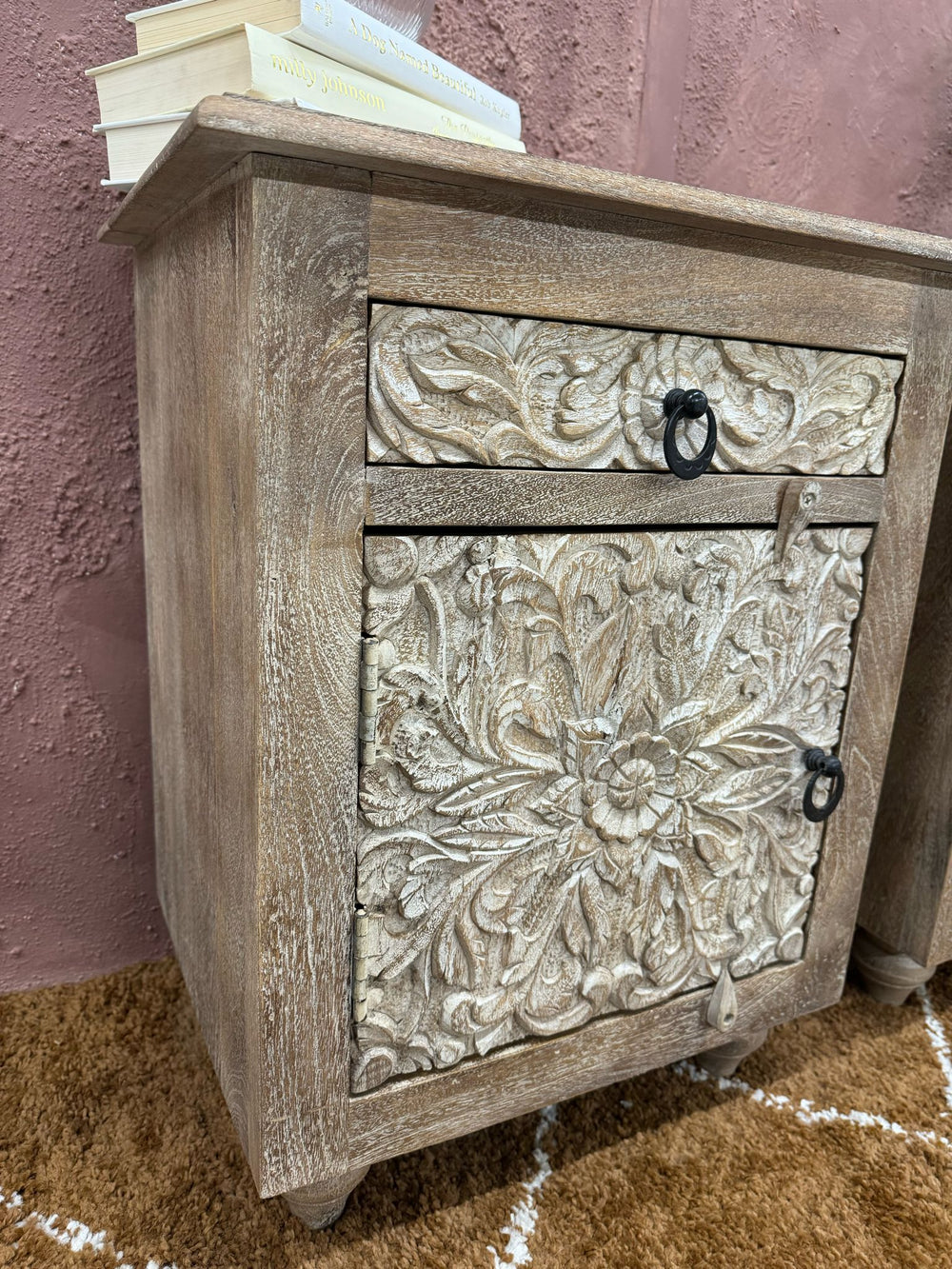 Par de mesitas de noche de madera de mango talladas a mano con motivos florales