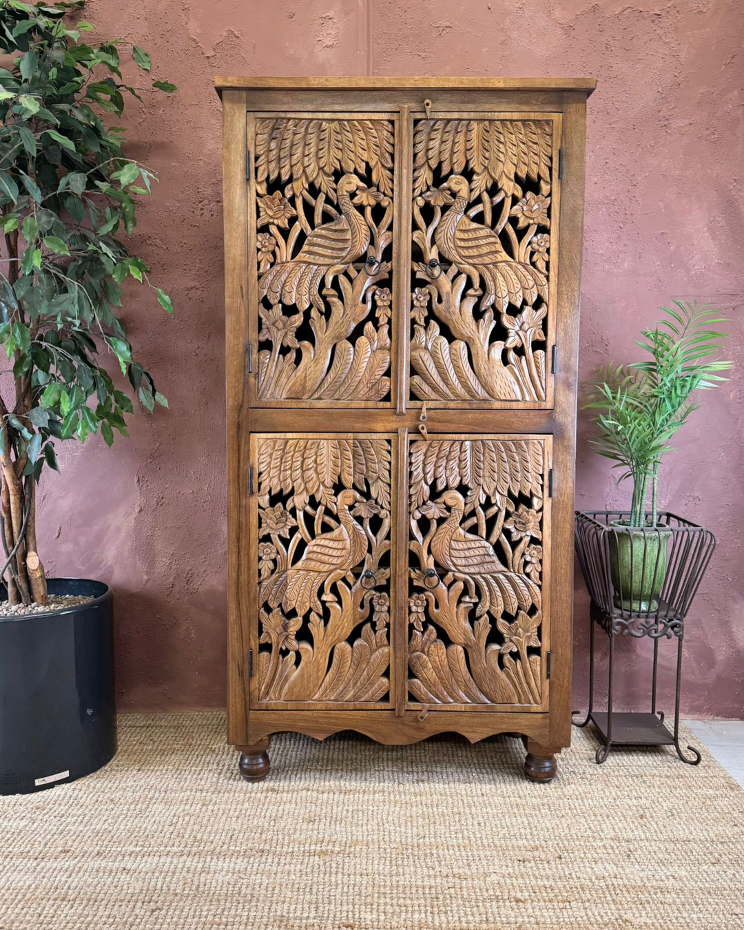 Armario de madera de mango tallado a mano con diseño de pavo real y flores en acabado natural.