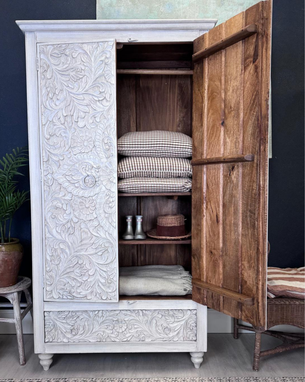 Armario de madera de mango tallada a mano – Acabado blanqueado