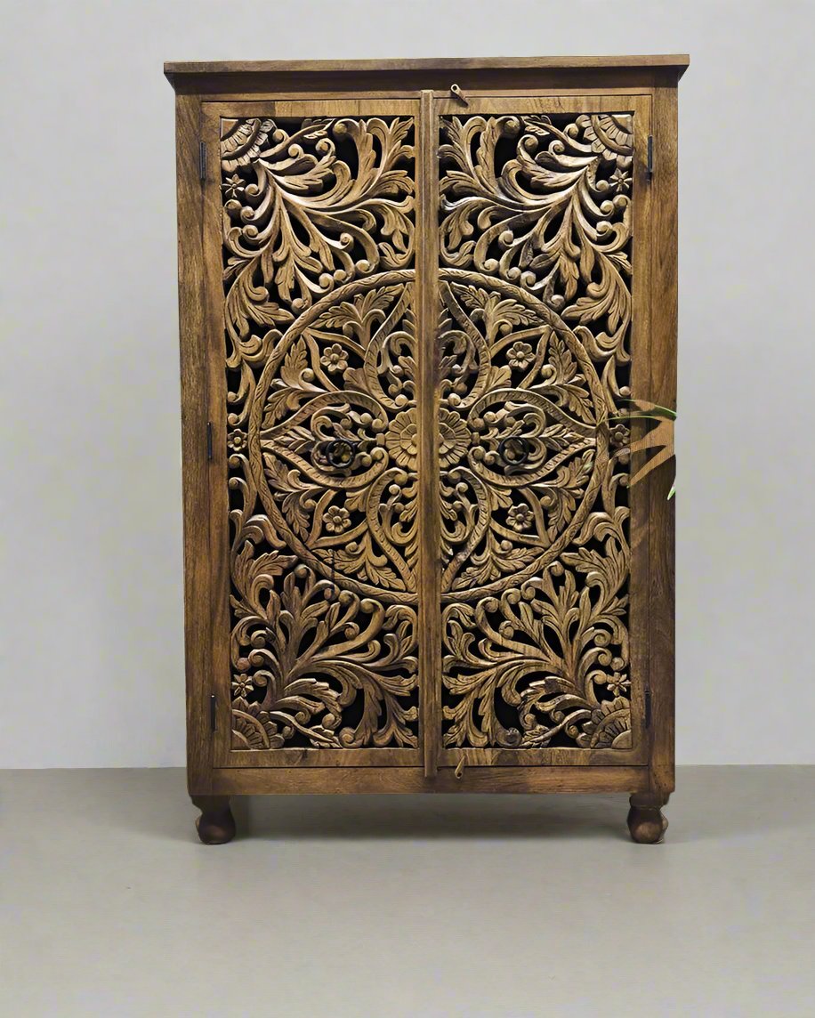 Armario de madera de mango tallado a mano con diseño floral circular – 20% de descuento