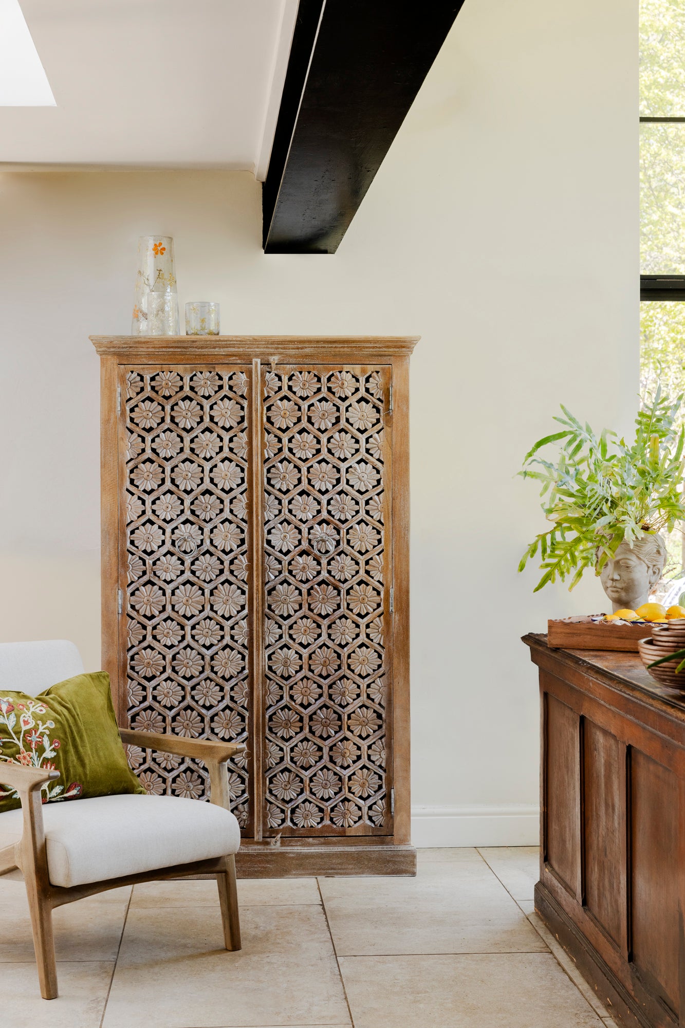 Armario de madera de mango lavada en crema, diseño Jali tallado a mano con estantes internos