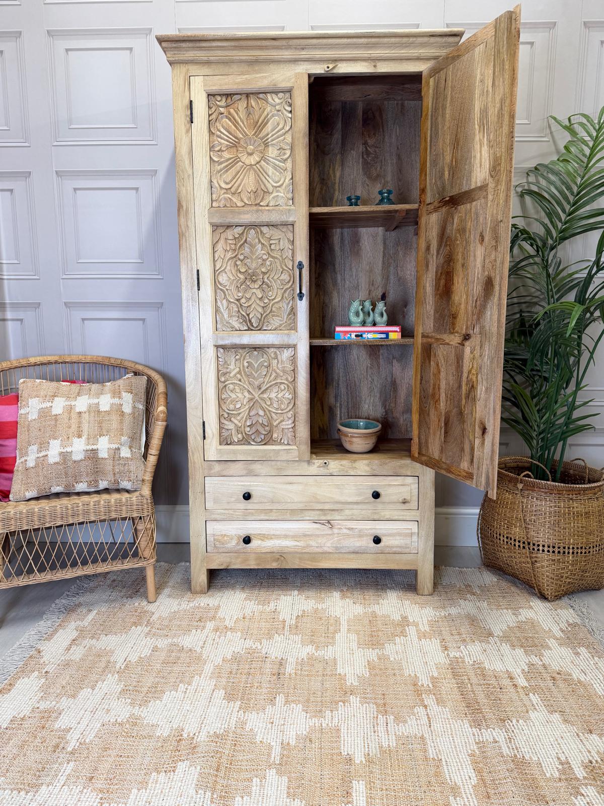 Aporta calidez, textura y artesanía a tu dormitorio con este hermoso armario de madera de mango tallado a mano. Diseñado con un refinado acabado natural claro, realza la veta y la belleza natural de la madera, a la vez que ofrece una practicidad excepcional.