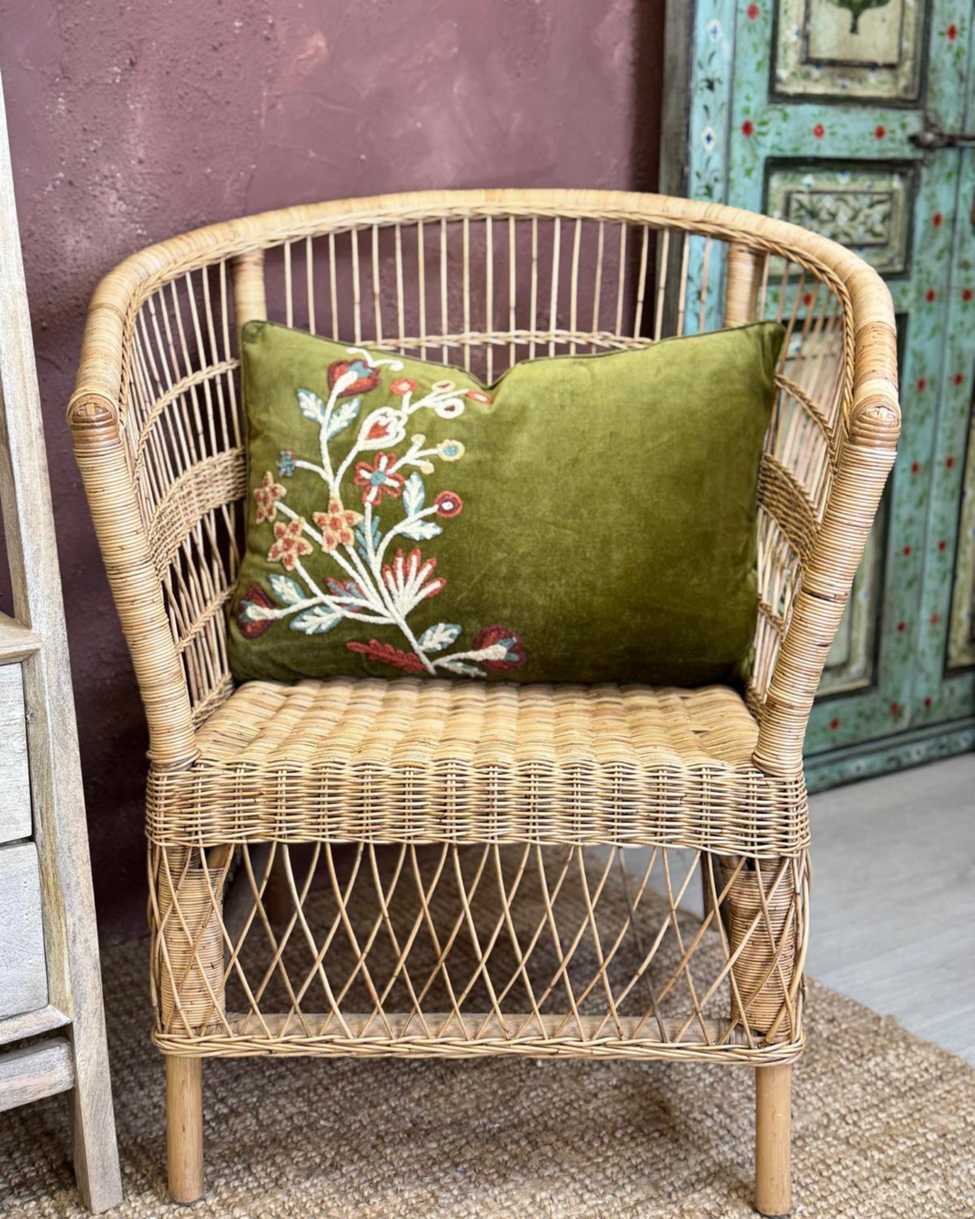 Funda de cojín de terciopelo bordado verde oliva con detalle floral vintage (40 x 60 cm)