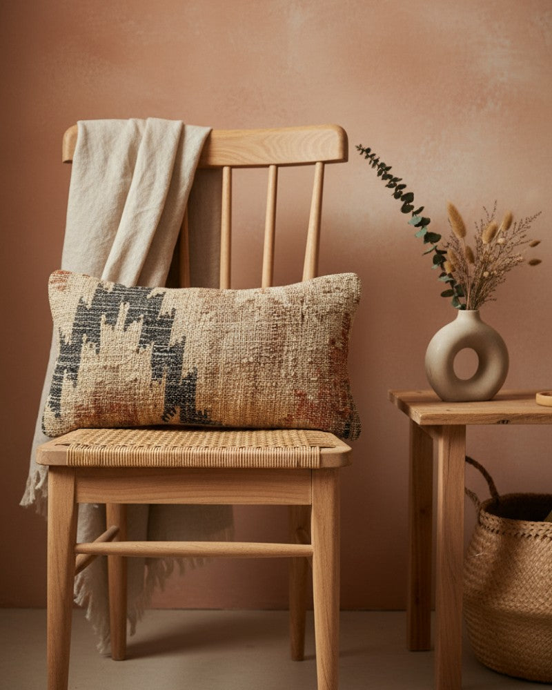 Funda de cojín de yute y bouclé tejida a mano – Rayas naturales y crema