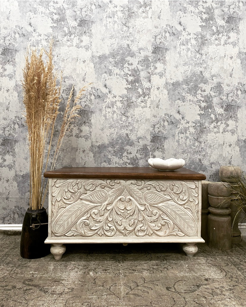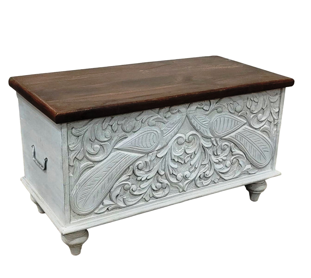 Baúl de madera de mango tallado a mano: diseño del Árbol de la Vida con acabado blanqueado
