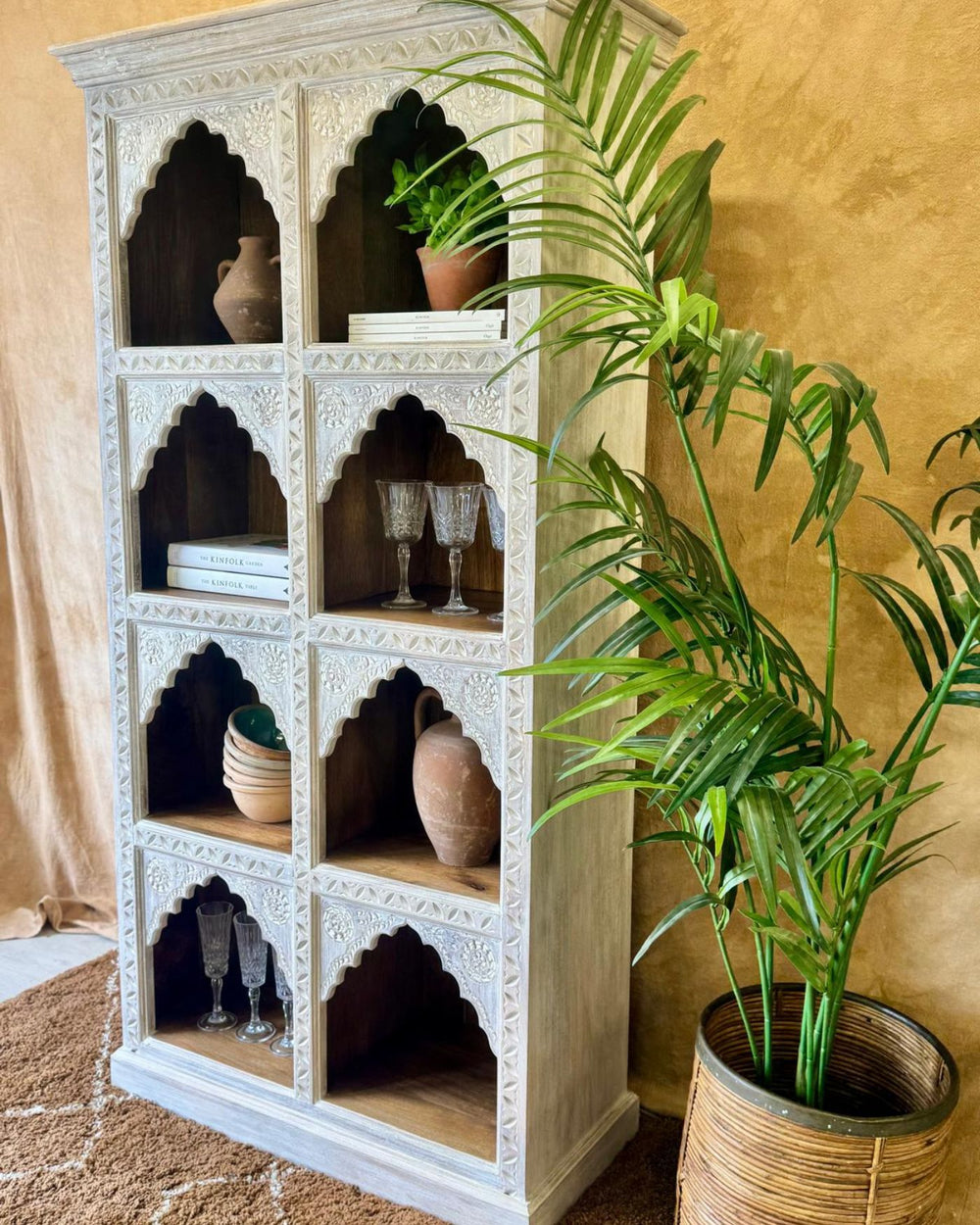 Librería de madera de mango tallada a mano, con acabado blanqueado y ocho estantes arqueados.