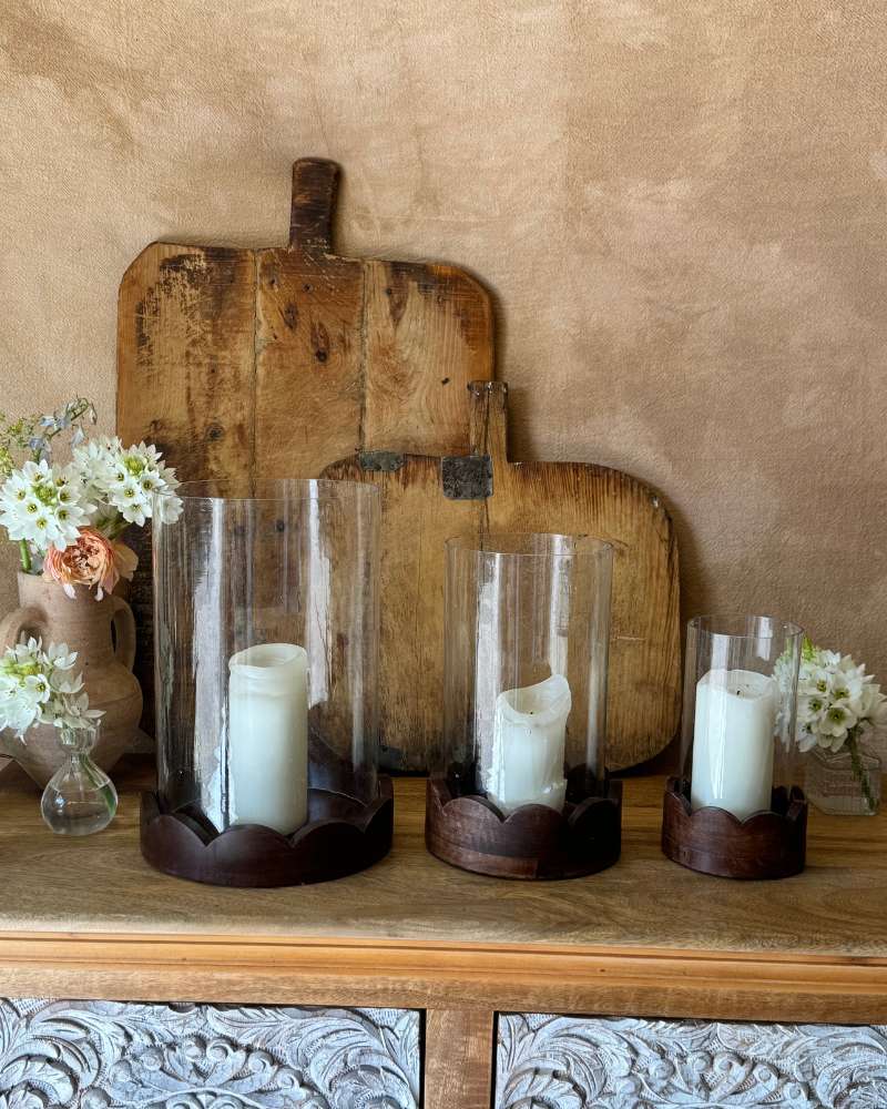 Juego de 3 candelabros Hurricane con base de madera de mango artesanal.