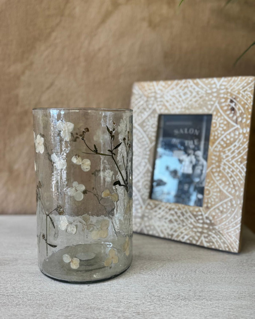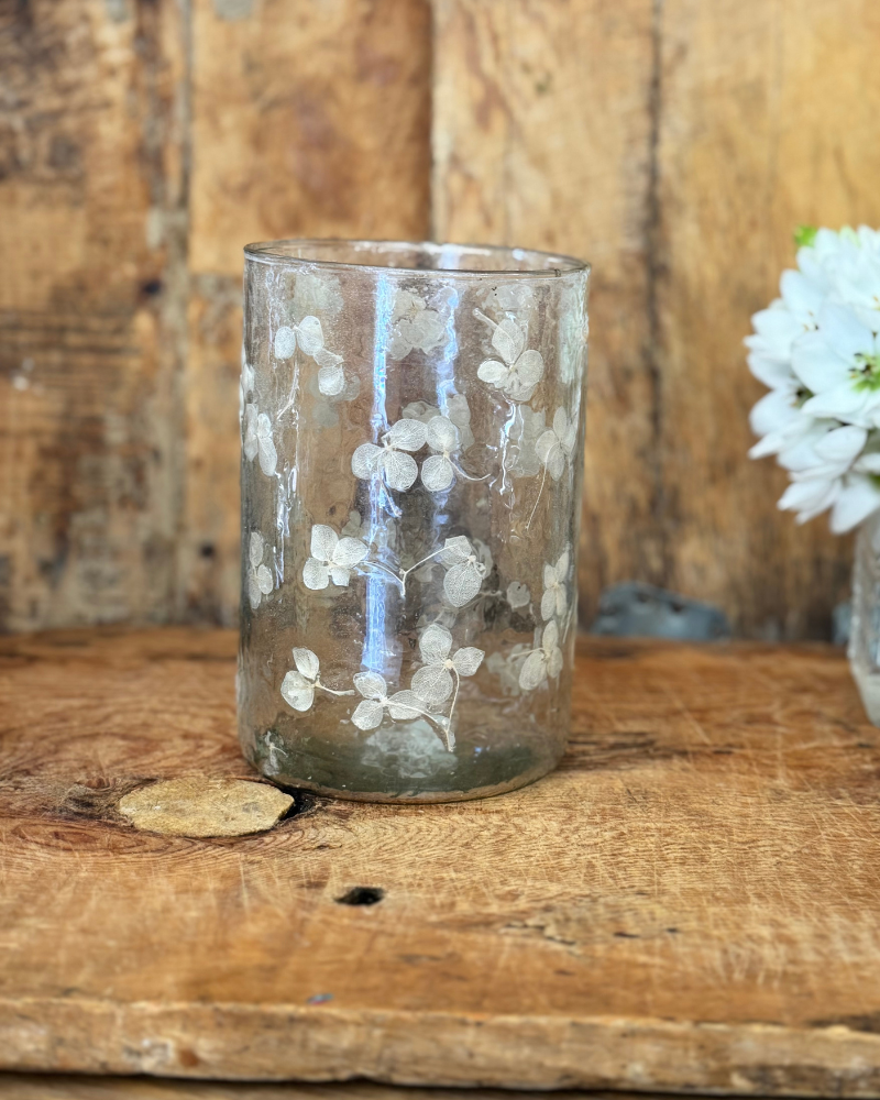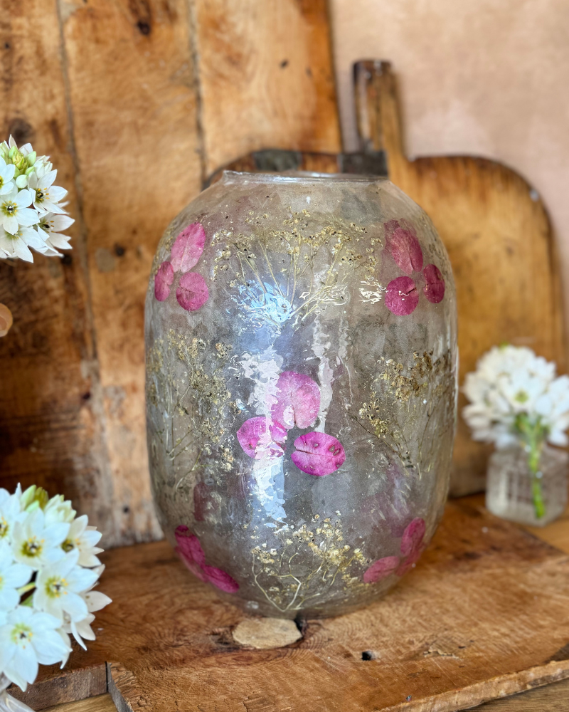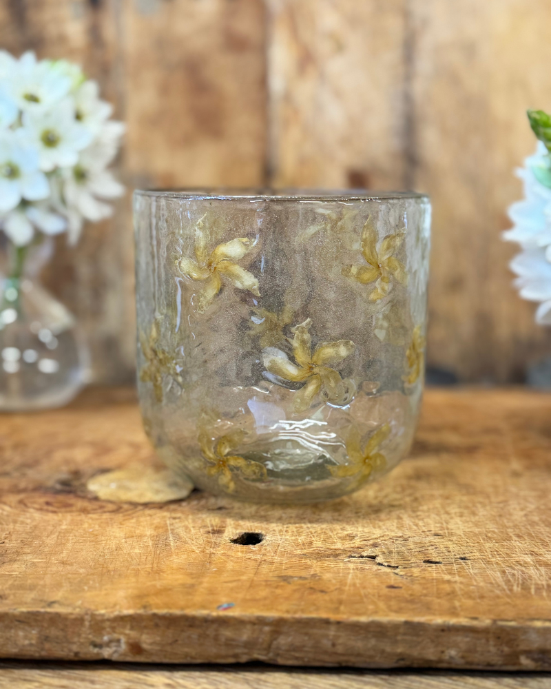 Jarrón o portavelas grande de vidrio reciclado con flores prensadas – 12 cm