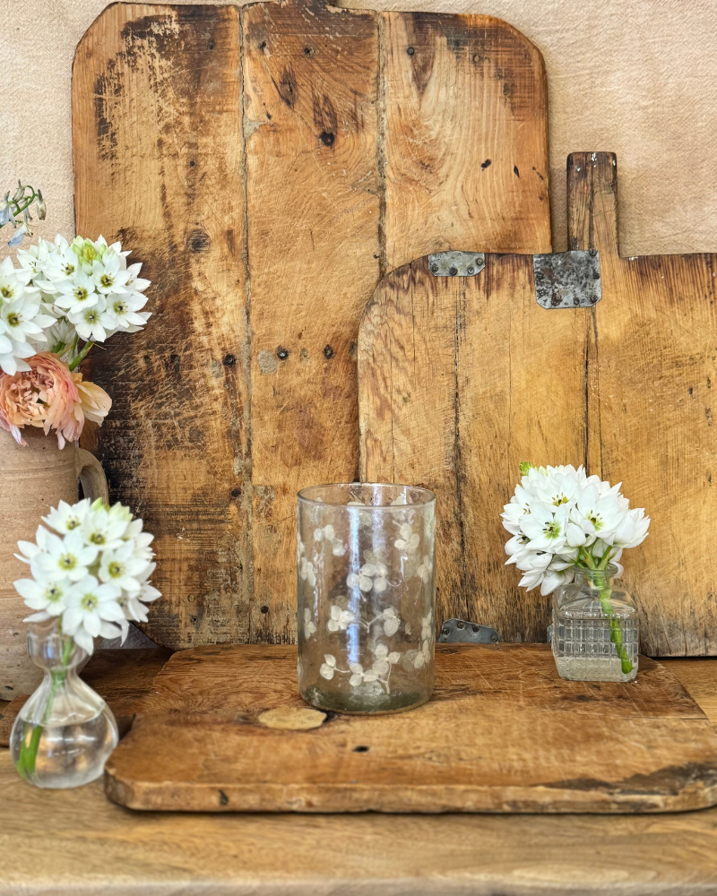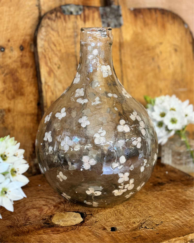 Jarrón alto de vidrio reciclado soplado a mano con detalles de flores prensadas