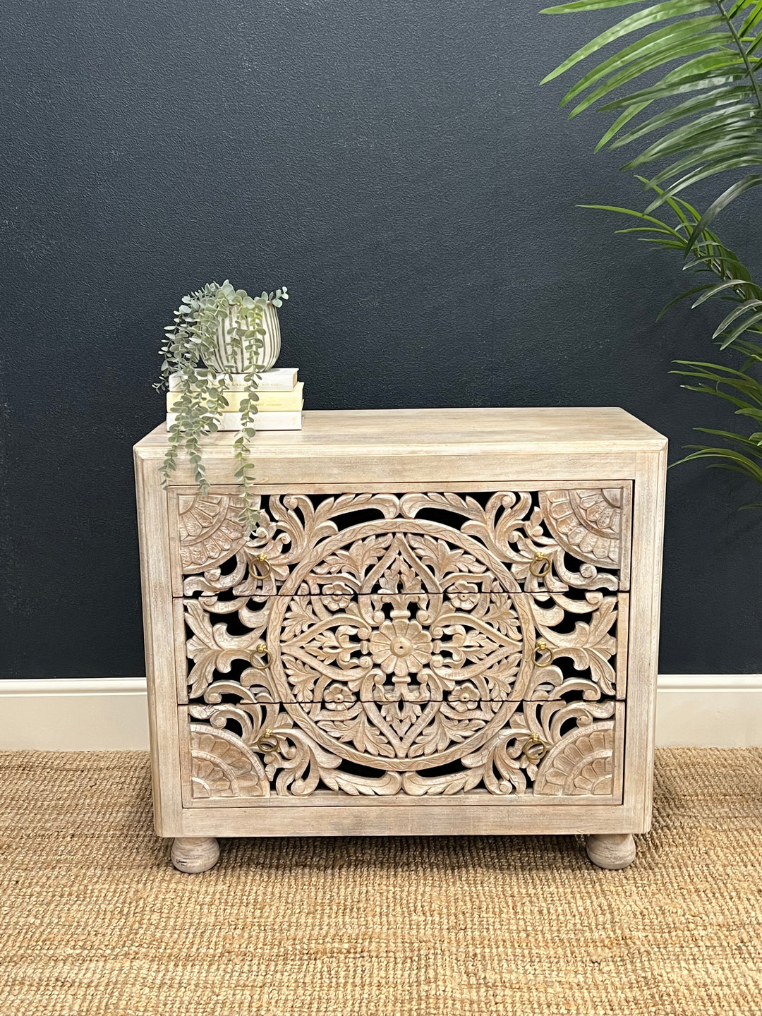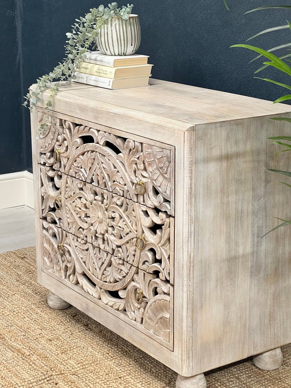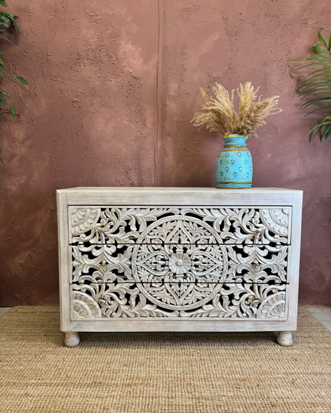 Cómoda de tres cajones de madera de mango tallada a mano, acabado blanqueado