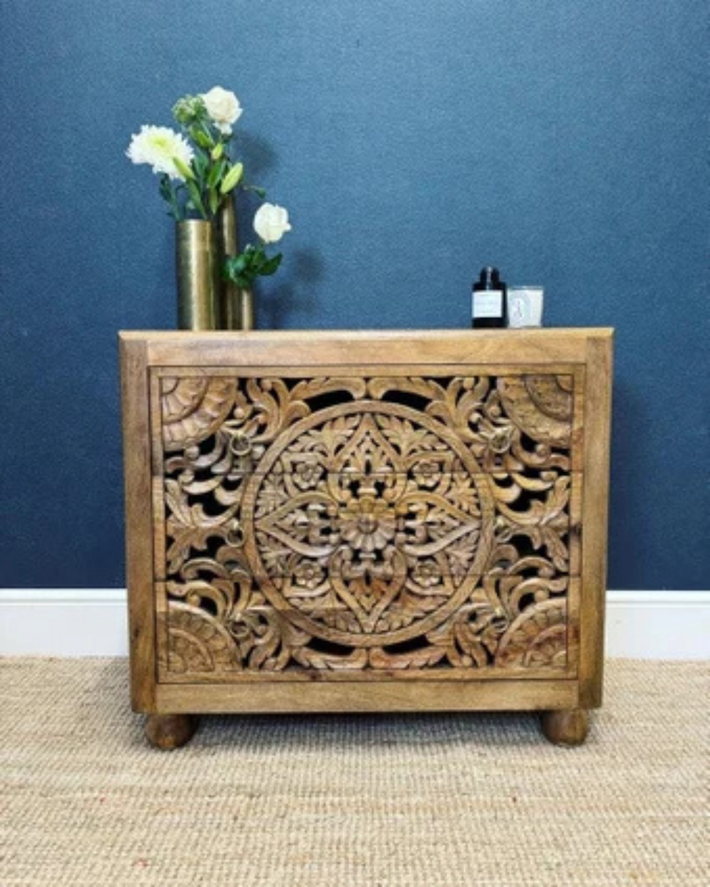 Cómoda de madera de mango con 3 cajones y diseño floral