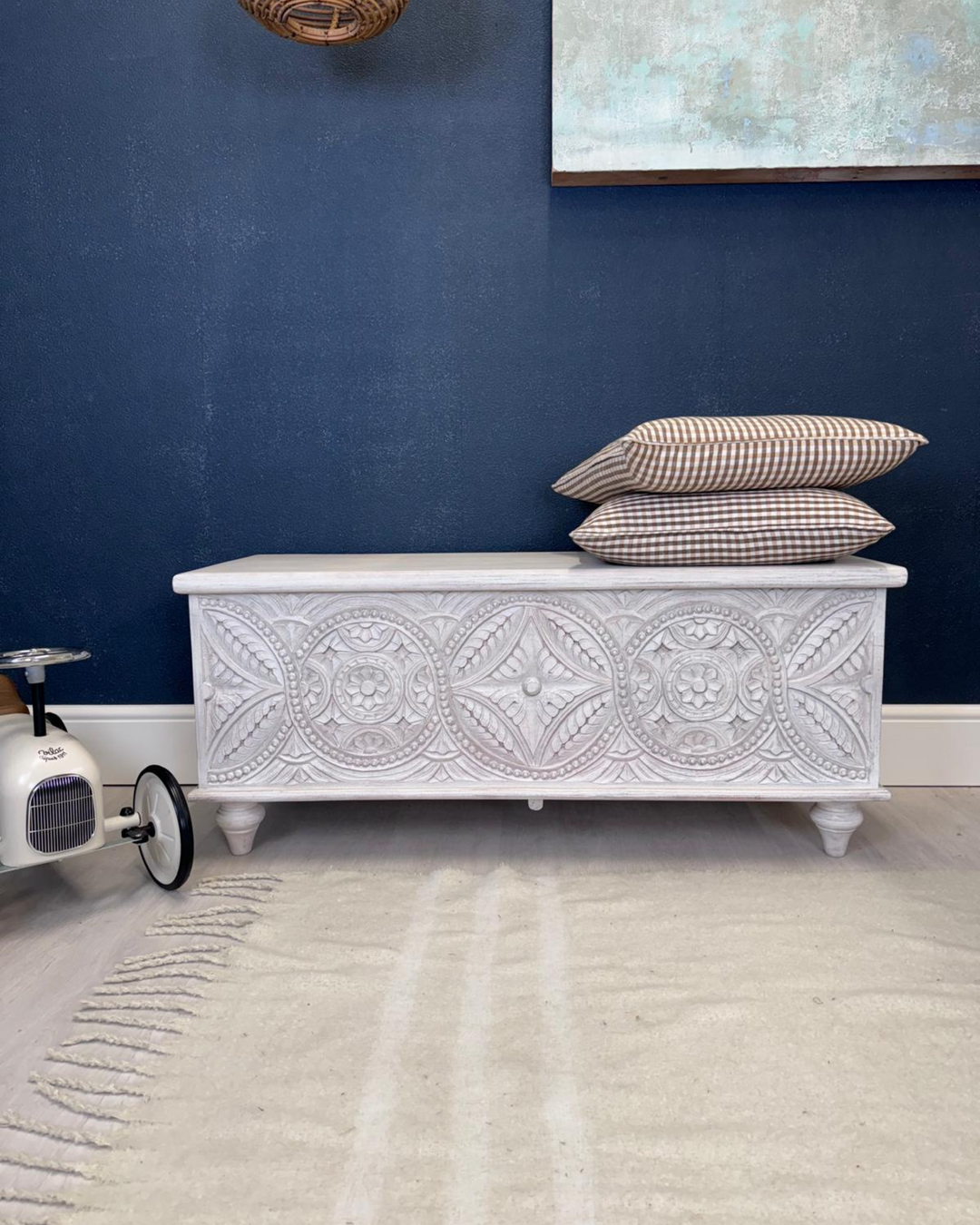 Baúl de madera de mango tallado a mano: diseño del Árbol de la Vida con acabado blanqueado