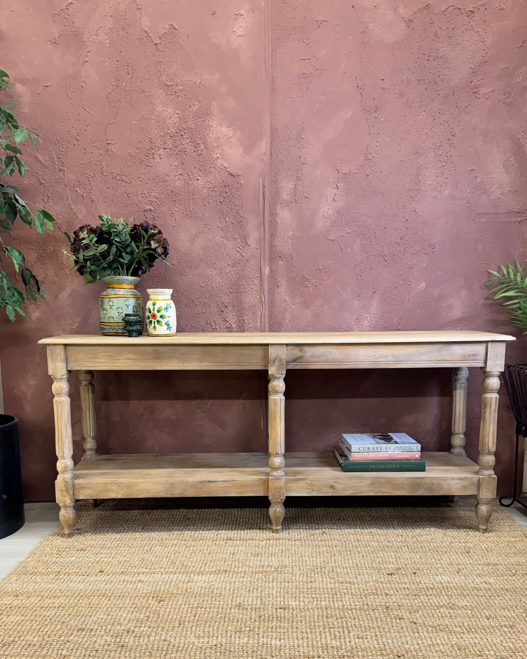 Consola larga de madera de mango tallada a mano con estante, acabado natural