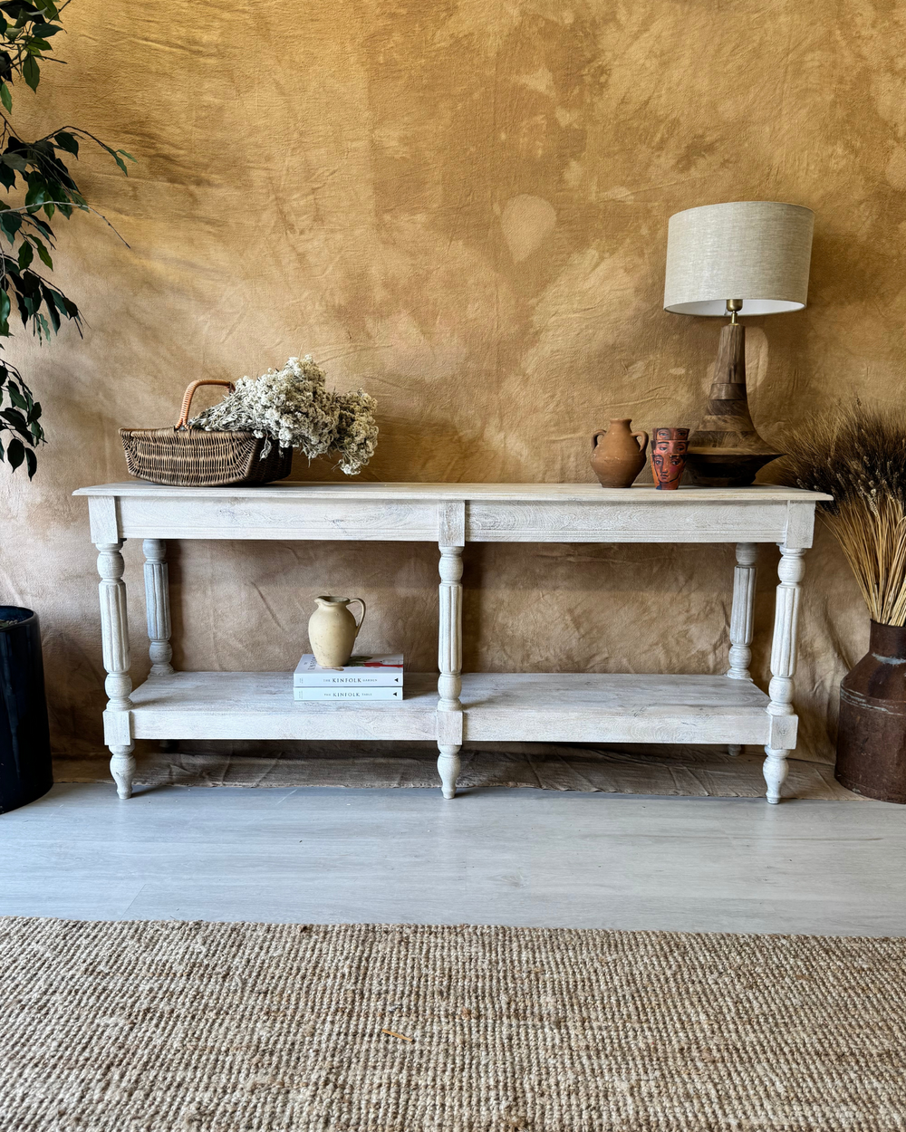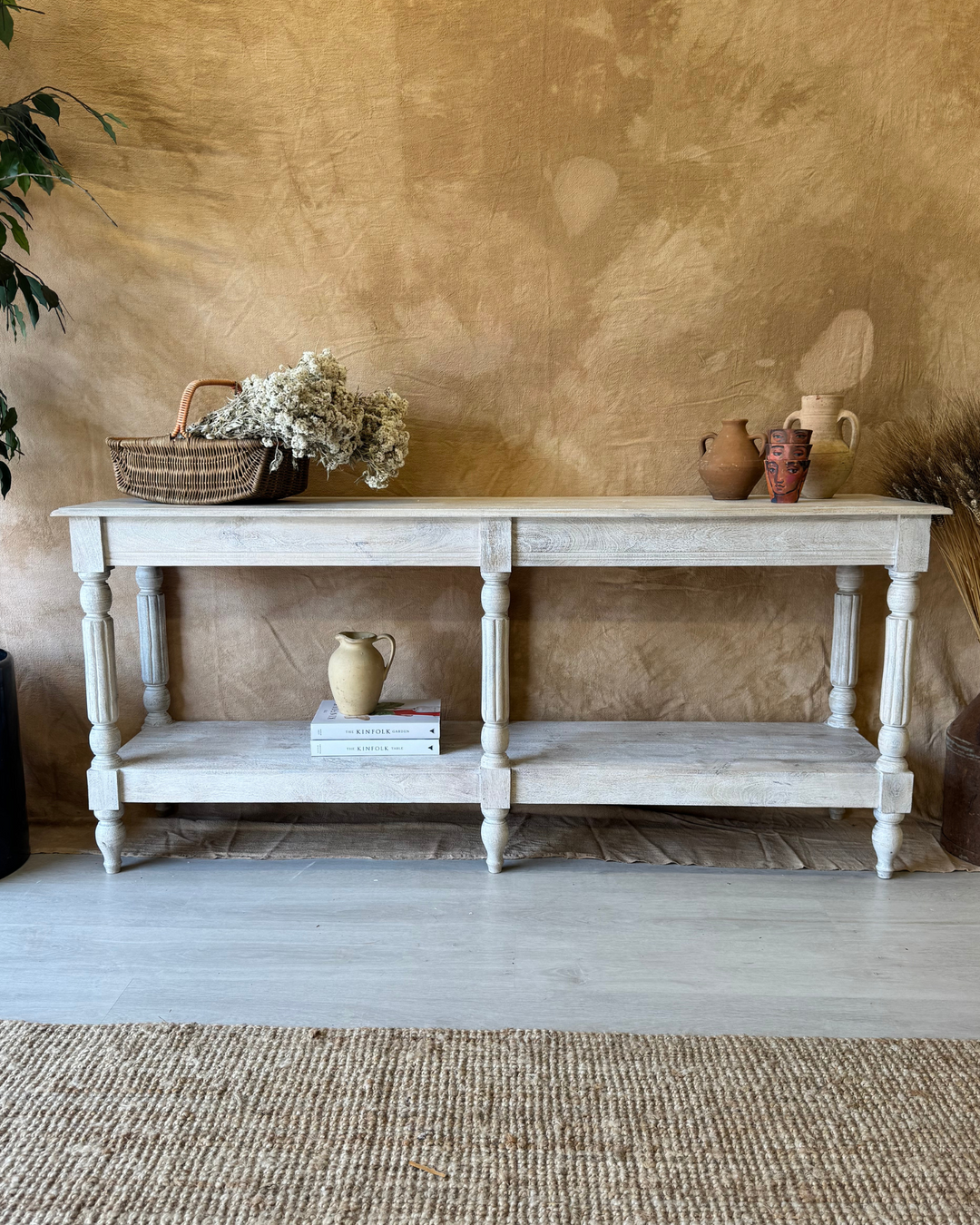 Consola larga de madera de mango tallada a mano con estante, acabado en crema