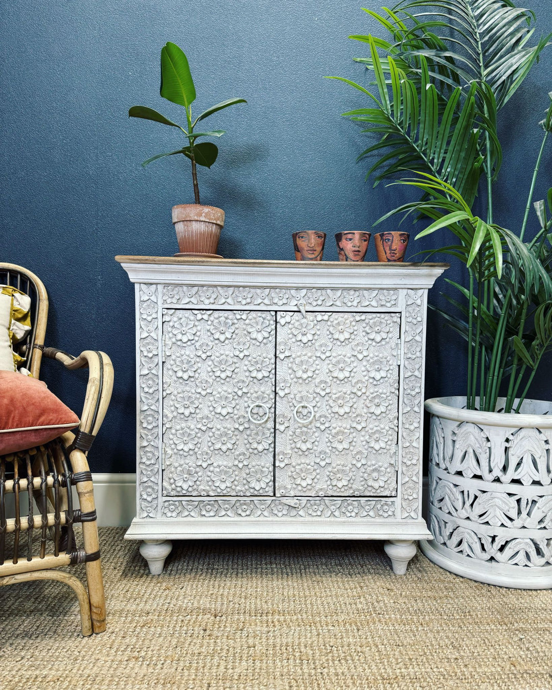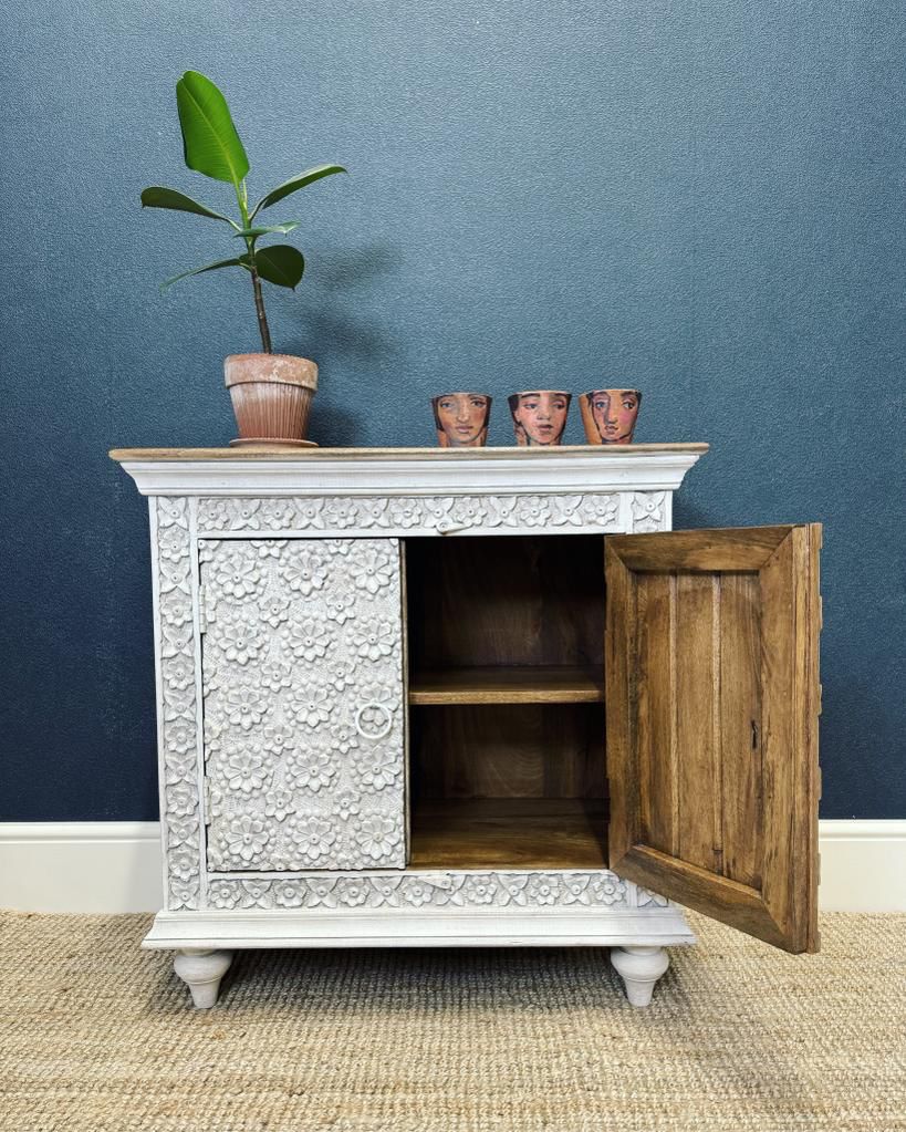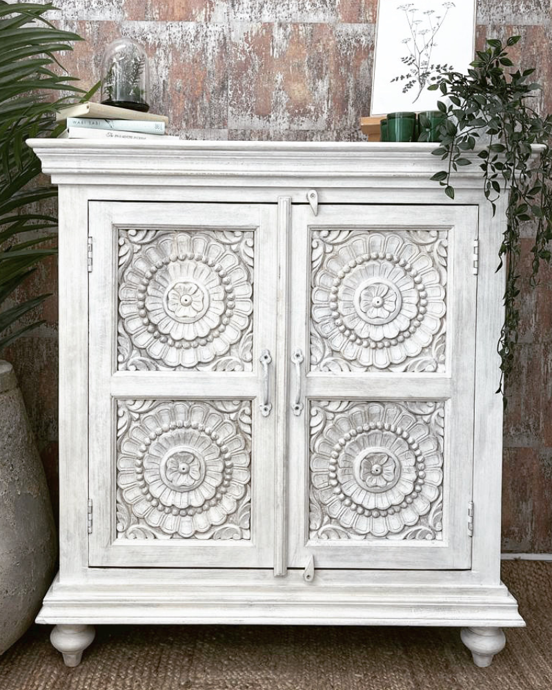 Aparador de madera de mango blanqueada con diseño floral tallado a mano