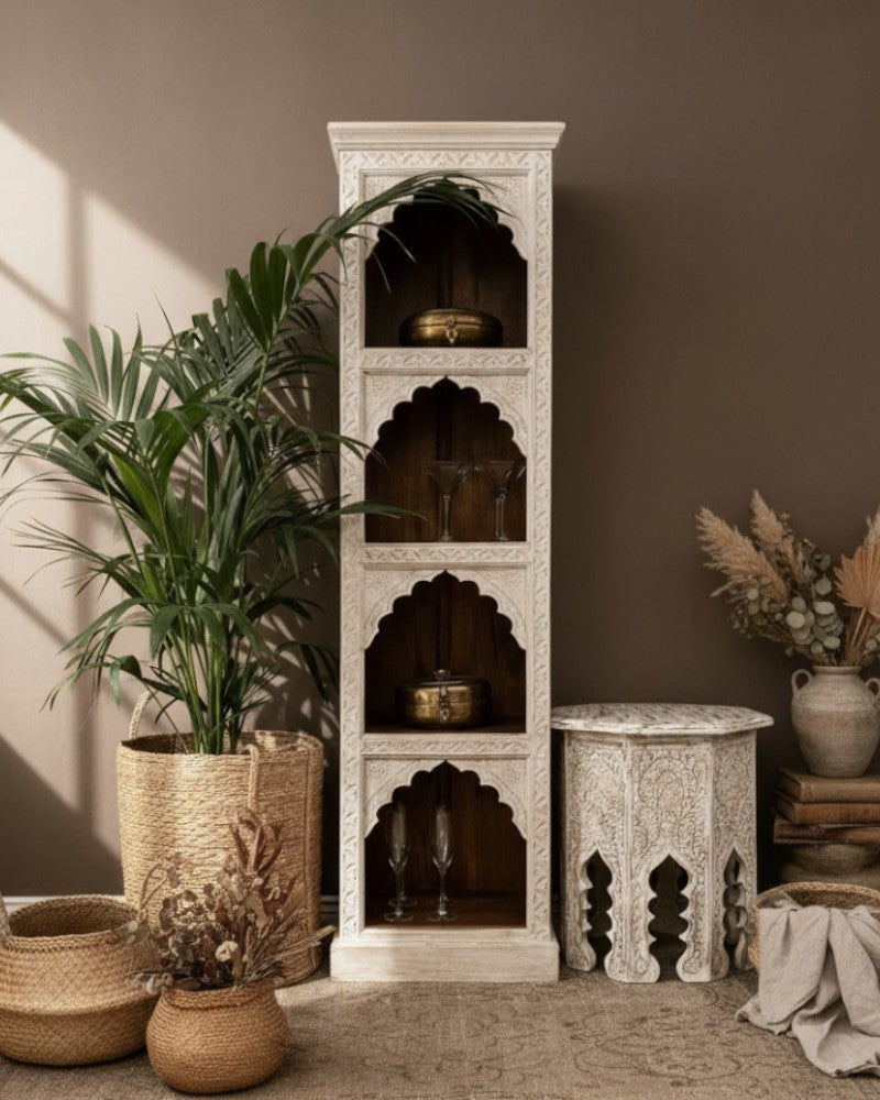 Librería de madera de mango tallada a mano, con acabado blanqueado y cuatro estantes arqueados.