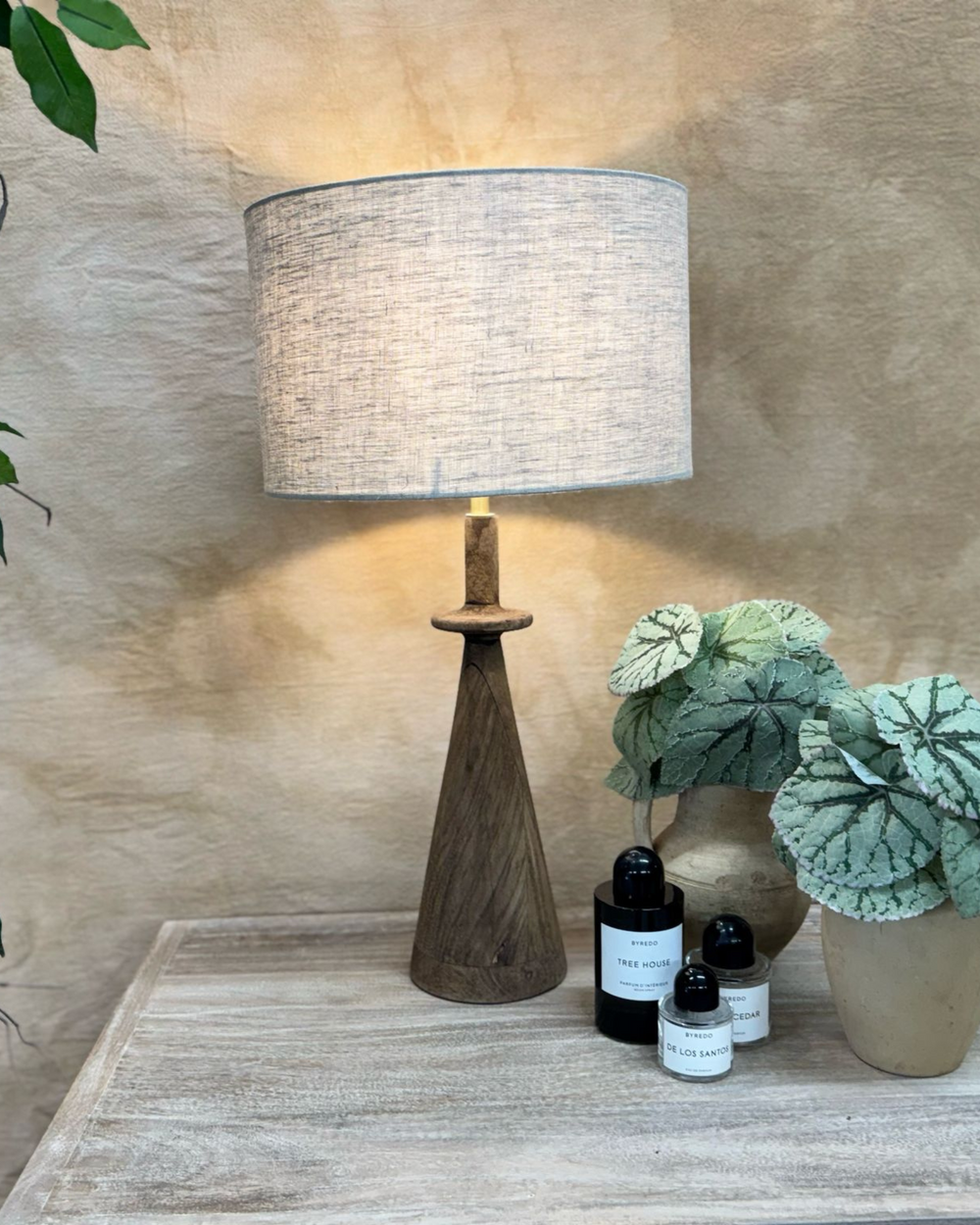 Lámpara de mesa de madera de mango: diseño escultural con pantalla de lino