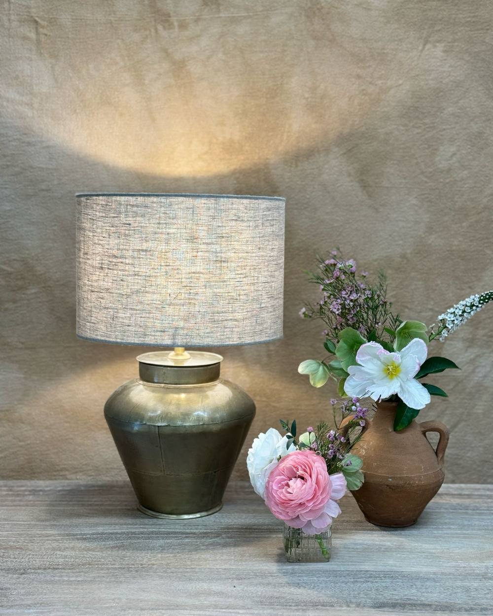 Lámpara de mesa de latón: diseño pequeño de inspiración vintage con pantalla de lino
