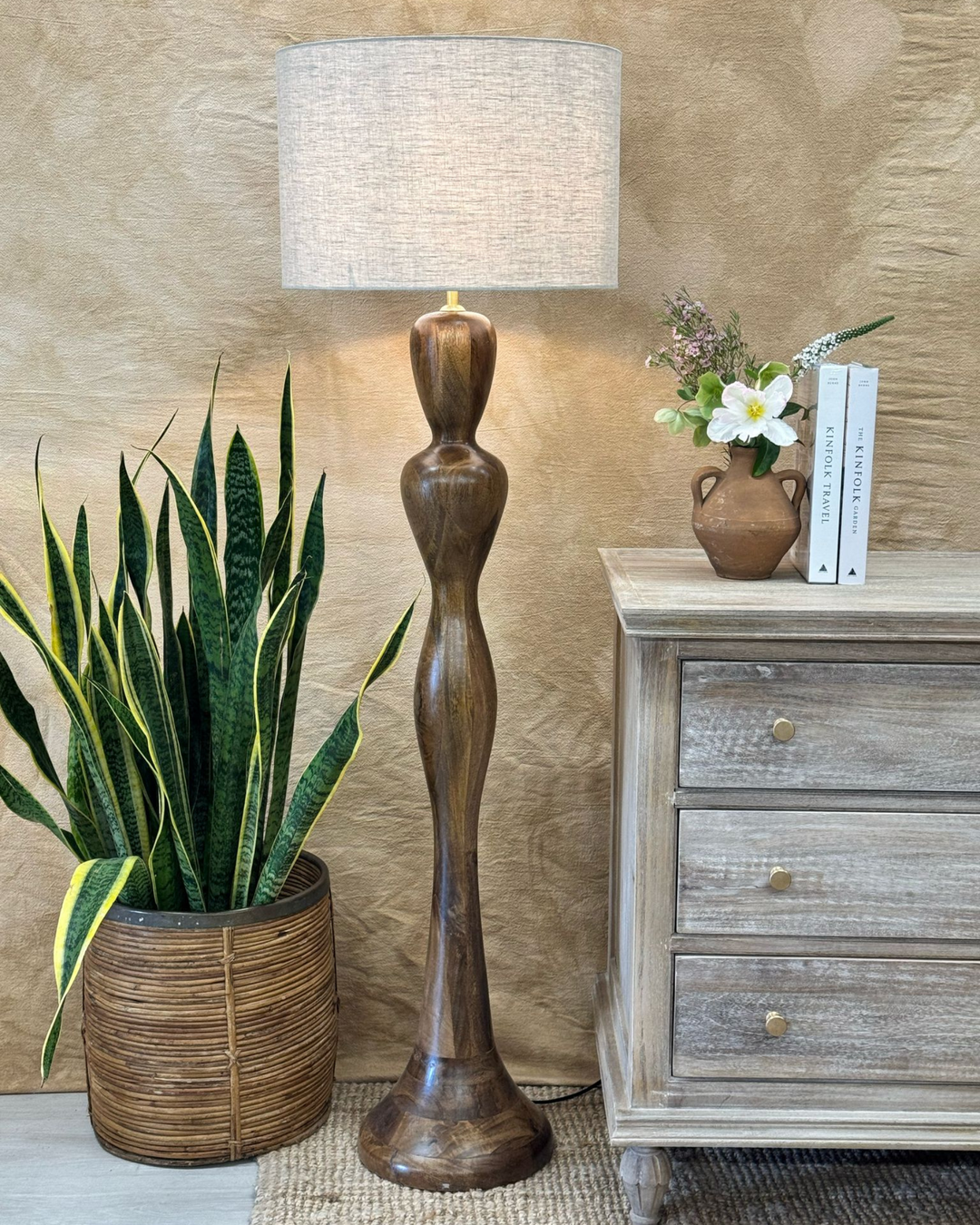 Lámpara de pie de madera de mango artesanal con pantalla de lino (acabado pulido)