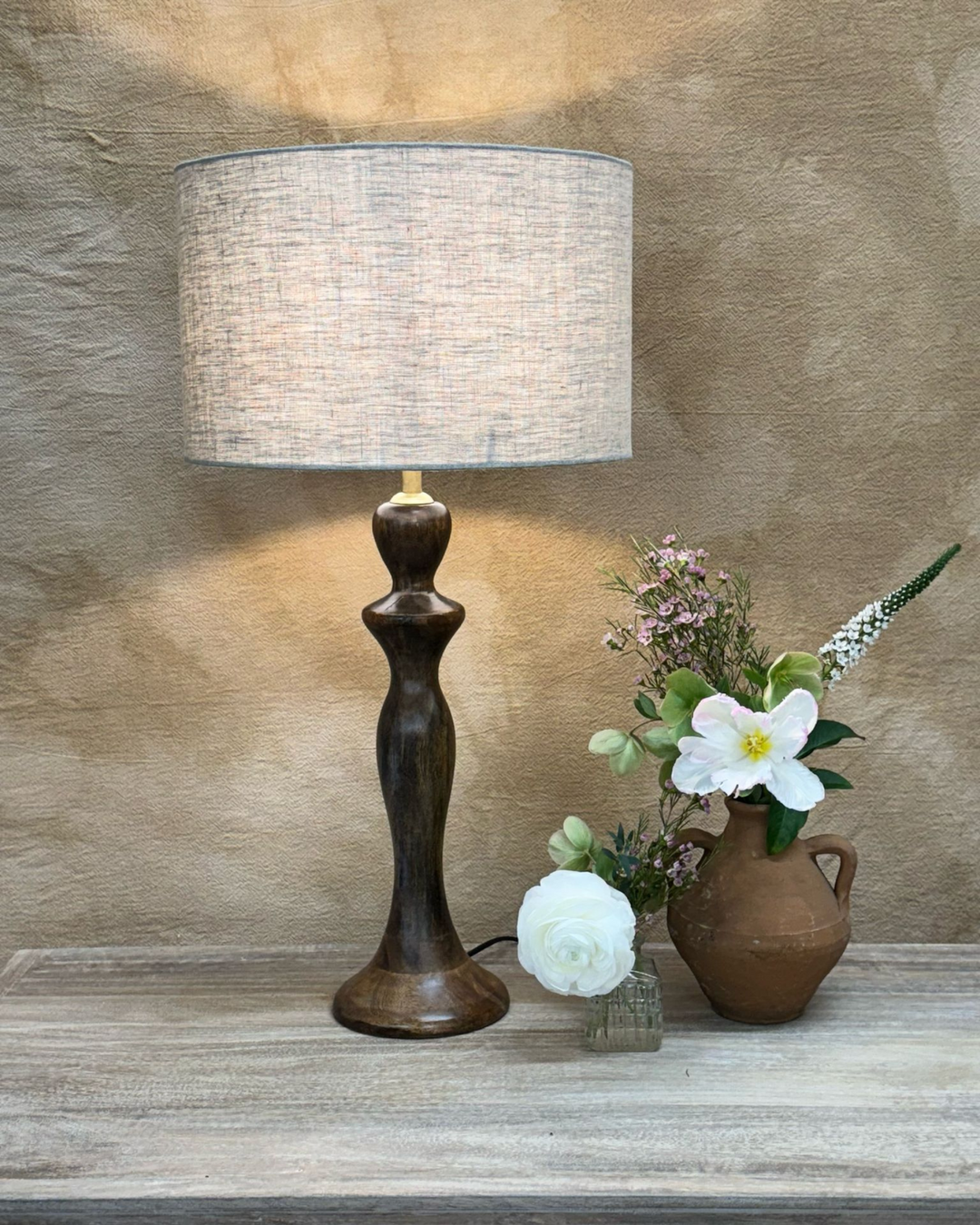 Lámpara de mesa artesanal de madera de mango con pantalla de lino y acabado pulido.