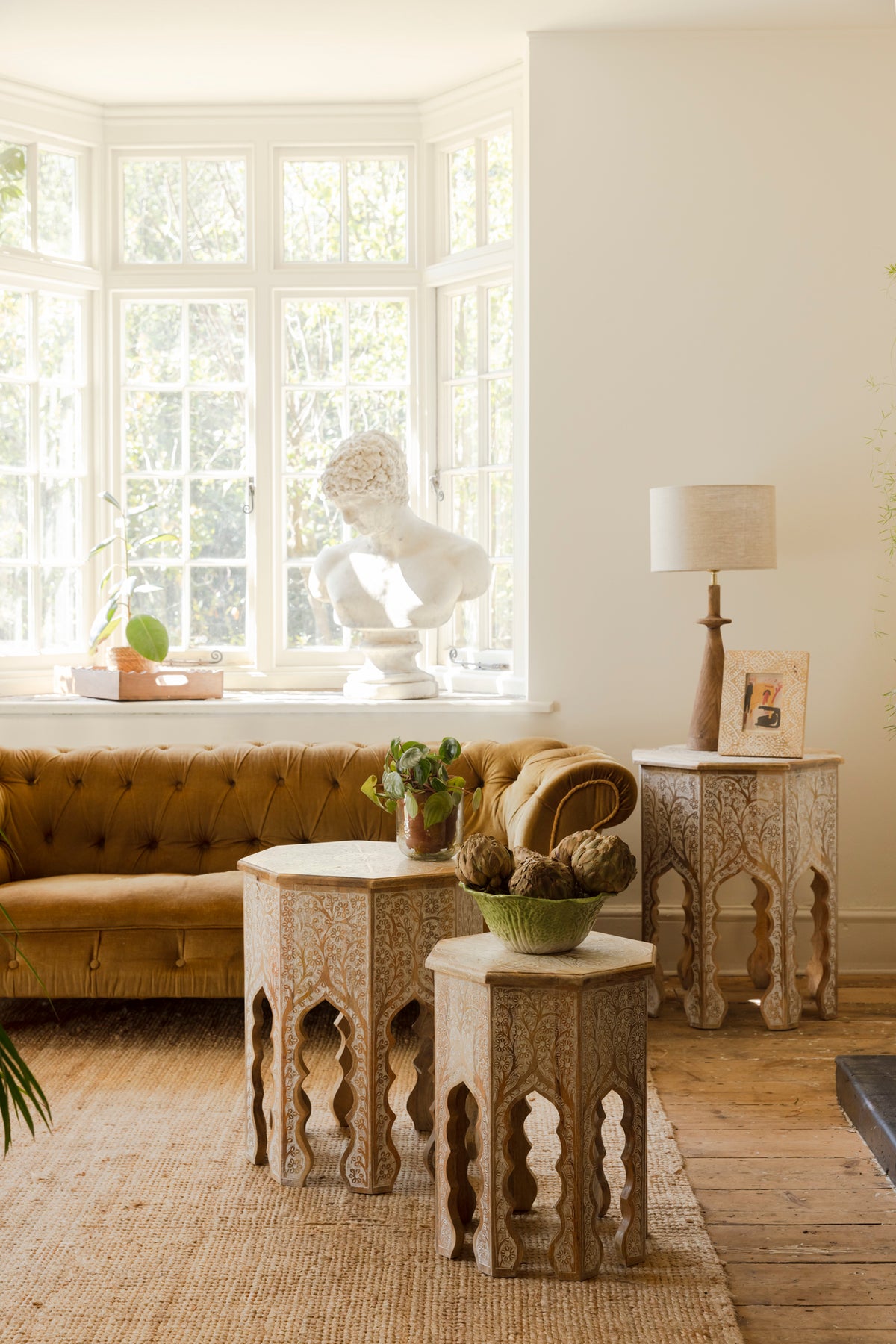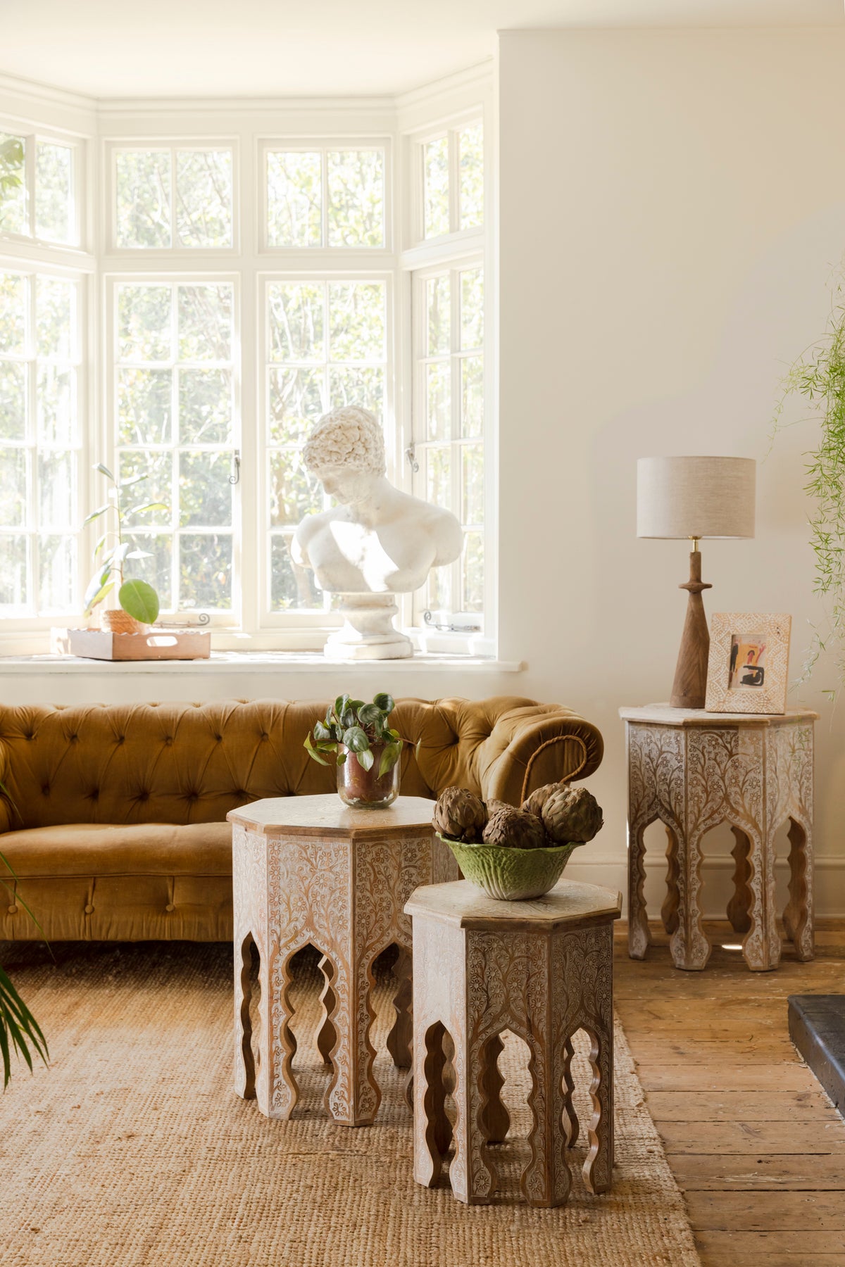 Dale un toque de artesanía a tu hogar con este exquisito juego de tres mesas auxiliares indias octogonales . Fabricadas con madera natural recuperada , cada mesa presenta una impresionante forma octogonal , elegantemente sostenida por patas arqueadas tradicionales, inspiradas en la arquitectura clásica india. Los intrincados motivos florales blancos pintados a mano , elaborados por hábiles artesanos, ofrecen un contraste delicado y llamativo con la veta natural de la madera.