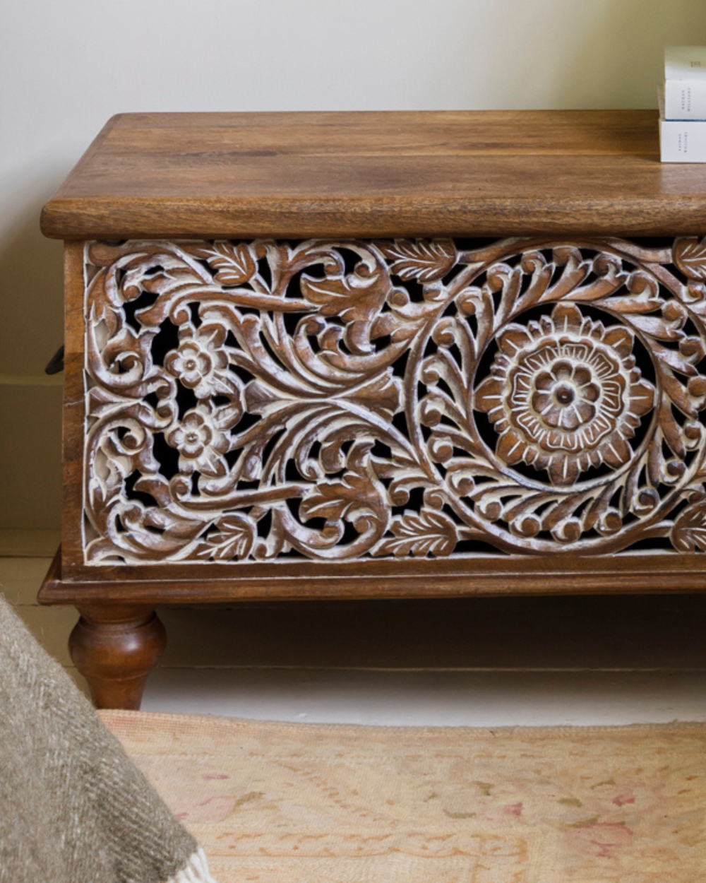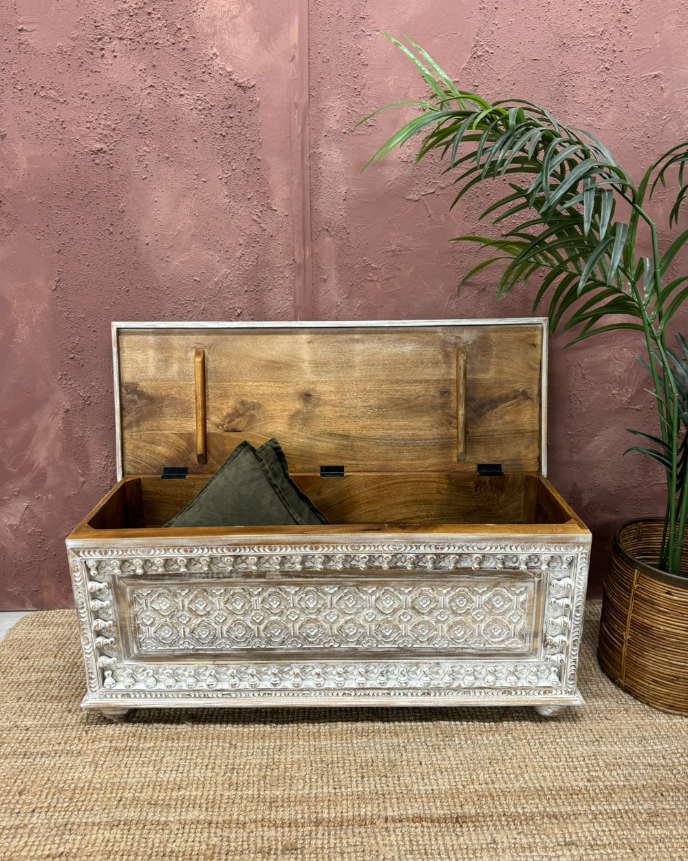 Nuestra colección de cajas y baúles de almacenamiento combina una forma elegante con una función bien pensada. Cada pieza está tallada a mano con maestría en madera de mango de origen sostenible por artesanos que trabajan en entornos de comercio justo, celebrando generaciones de artesanía. La veta natural de la madera brilla a través de acabados suaves y táctiles, mientras que los tallados florales y los detalles de latón envejecido le otorgan a cada baúl una calidad discretamente atemporal.