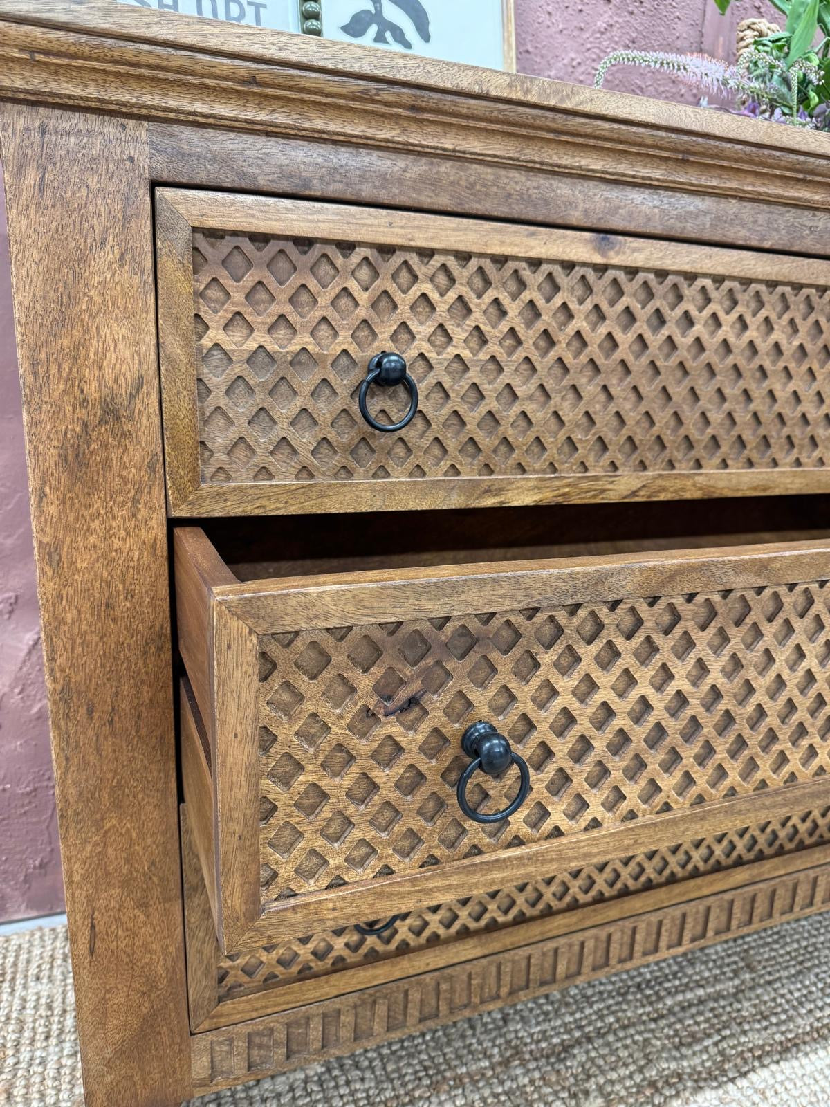 Esta elegante cómoda de 3 cajones está hecha a mano con madera maciza de mango, y luce frentes de cajón tallados a mano con gran detalle. Cada patrón geométrico repetitivo está cuidadosamente tallado por artesanos expertos, lo que le otorga a la pieza una distintiva sensación de textura, profundidad e individualidad.