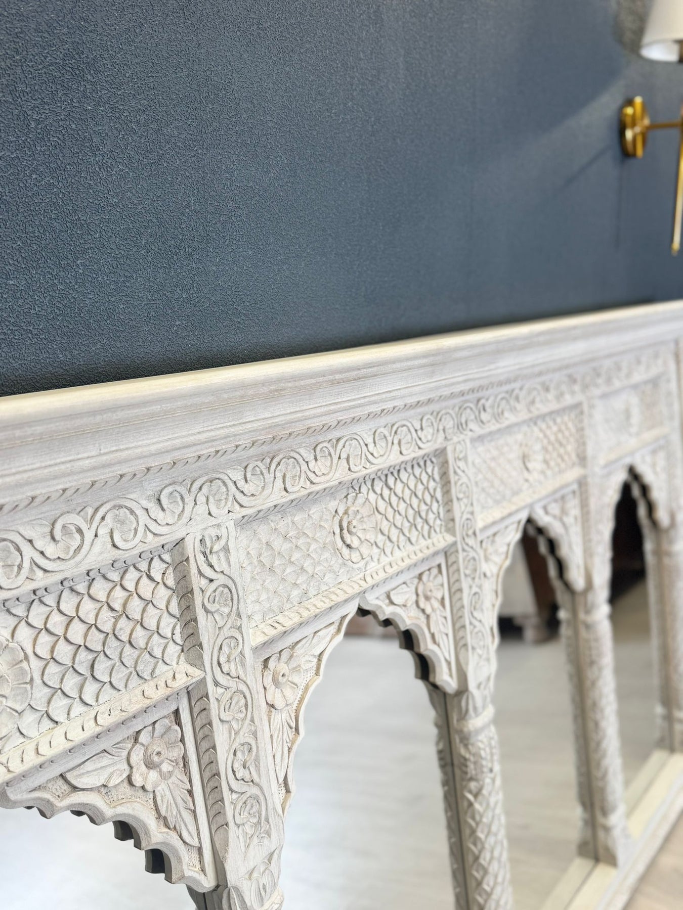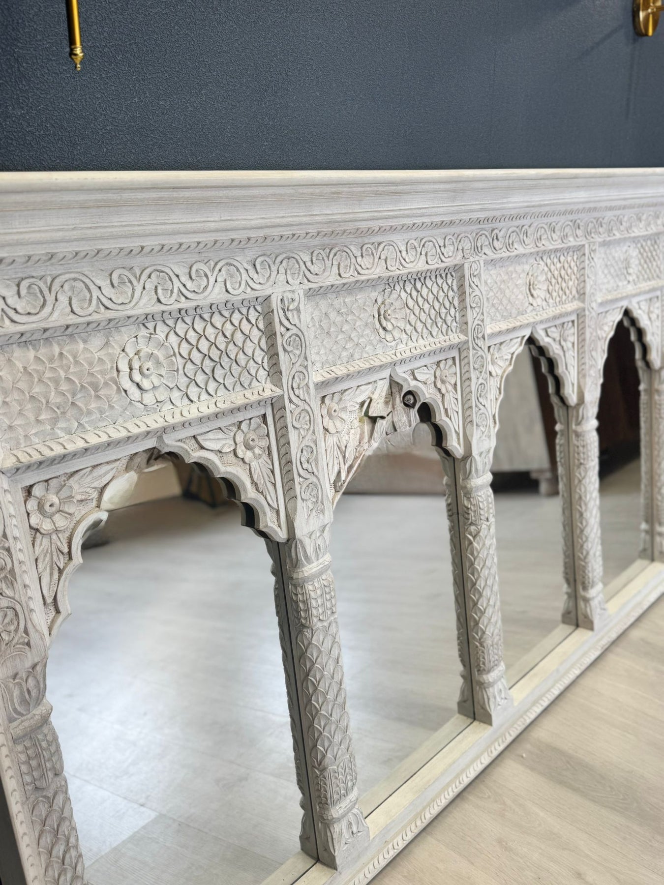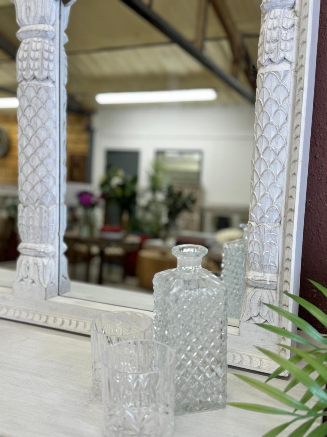 Fabricado artesanalmente con madera de mango sostenible, el marco presenta un sutil acabado arenado en crema que realza sus detalladas tallas, a la vez que le confiere un encanto delicado y atemporal. Su gran tamaño y los paneles reflectantes crean una sensación de amplitud y luminosidad, lo que lo hace perfecto para interiores amplios.