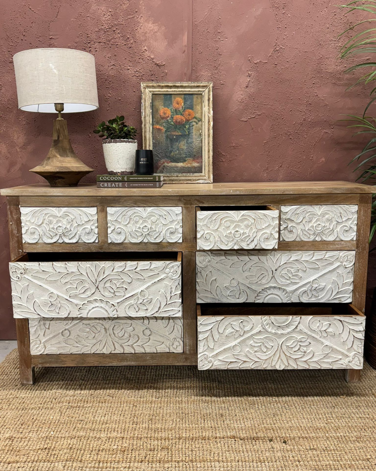 Una hermosa combinación de funcionalidad y artesanía, esta gran cómoda de 8 cajones está tallada a mano en madera maciza de mango y cuenta con un acabado llamativo: frentes de cajón encalados y un marco de madera natural. Cada cajón presenta intrincados tallados florales y geométricos, que cobran vida mediante antiguas técnicas de ebanistería indias y están delicadamente encalados para realzar su profundidad y detalle.