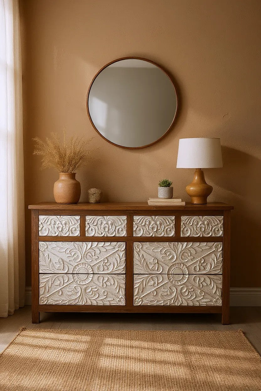 Esta elegante cómoda ofrece mucho más que espacio de almacenamiento: es una pieza clave de diseño cuidado y arte cultural. Ideal para dormitorios, recibidores amplios o espacios diáfanos, sus ocho cajones profundos son perfectos para guardar ropa, ropa de cama o artículos esenciales del hogar con facilidad.