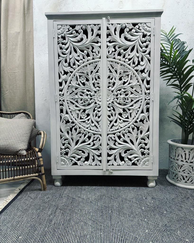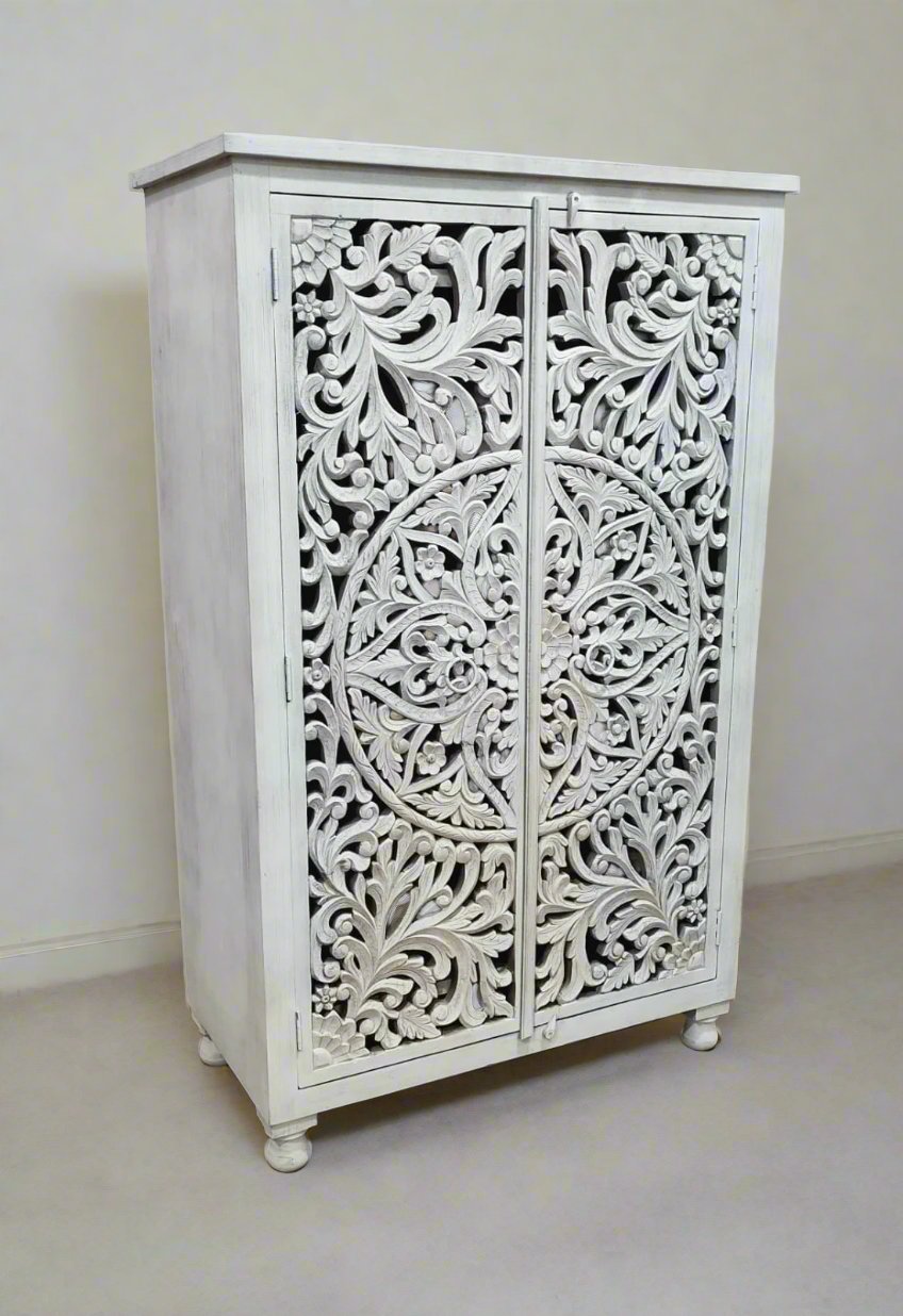 Armario de madera de mango tallada a mano, acabado blanqueado con detalles florales