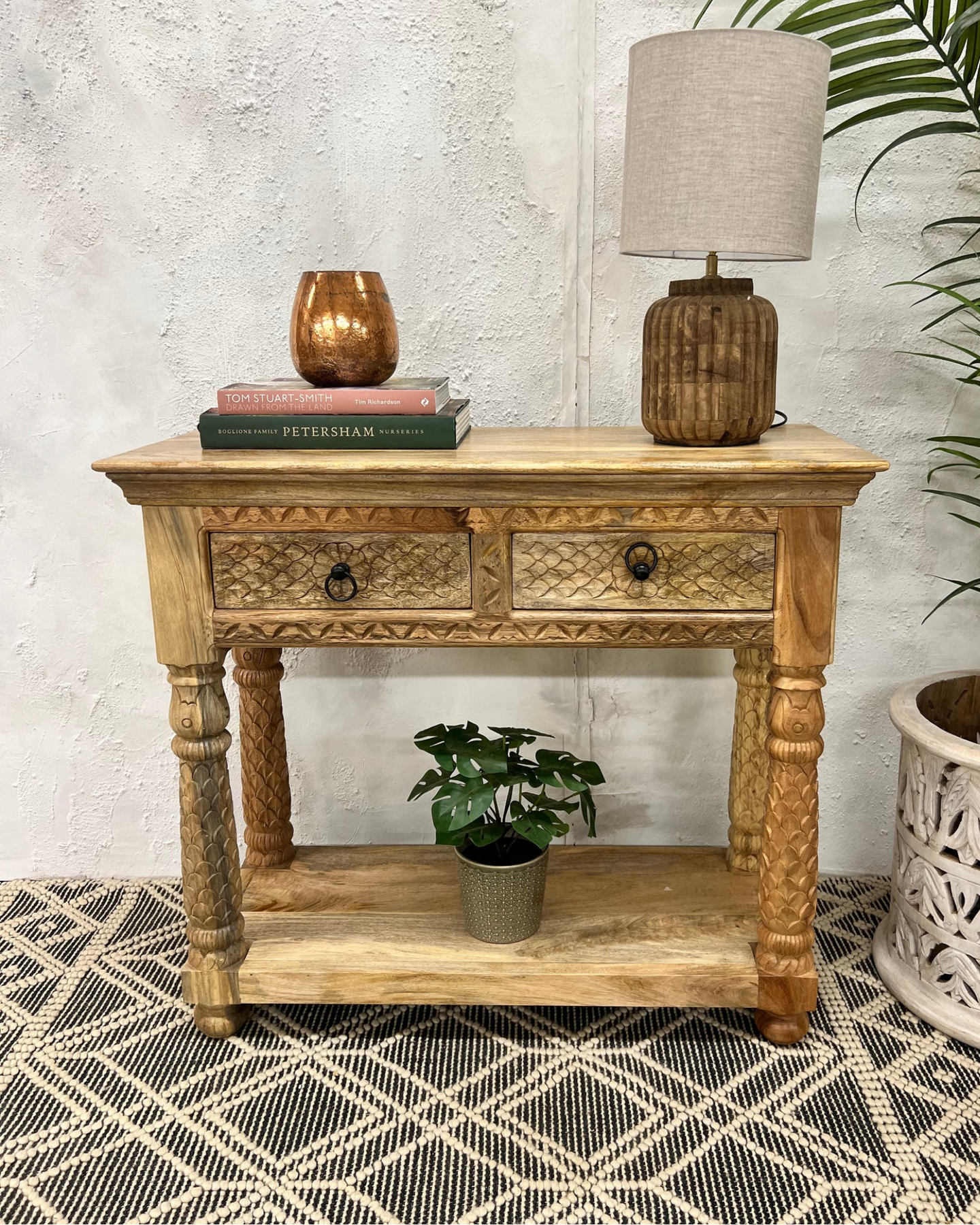 Consola de madera de mango tallada a mano, acabado pulido y dos cajones.